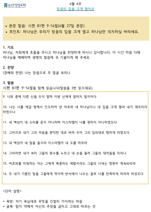 2025년 6월 넷째주 수요 가정예배 순서지 2025.06.20 20:55 소식/가정예배 순서지 2025년 6월 4주 가정예배.pdf 0.10MB 공유하기 게시글 관리 높은뜻 안성교회 '소식 > 가정예배 순서지' 카테고리의 다른 글 2025년 7월 둘째주 수요 가정예배 순서지 (0) 2025.07.05 2025년 7월 첫째주 수요 가정예배 순서지 (0) 2025.06.28 2025년 6월 셋째주 수요 가정예배 순서지 (0) 2025.06.14 2025년 6월 둘째주 수요 가정예배 순서지 (0) 2025.06.06 2025년 5월 다섯째주 수요 가정예배 순서지 (0) 2025.05.31 댓글 공유하기 다른 글 댓글 이 글 공유하기 구독하기 구독하기 카카오톡 카카오톡 라인 라인 트위터 트위터 Facebook Facebook 카카오스토리 카카오스토리 밴드 밴드 네이버 블로그 네이버 블로그 Pocket Pocket Evernote Evernote 다른 글 2025년 7월 둘째주 수요 가정예배 순서지 2025년 7월 둘째주 수요 가정예배 순서지 2025.07.05 2025년 7월 첫째주 수요 가정예배 순서지 2025년 7월 첫째주 수요 가정예배 순서지 2025.06.28 2025년 6월 셋째주 수요 가정예배 순서지 2025년 6월 셋째주 수요 가정예배 순서지 2025.06.14 2025년 6월 둘째주 수요 가정예배 순서지 2025년 6월 둘째주 수요 가정예배 순서지 2025.06.06 다른 글 더 둘러보기