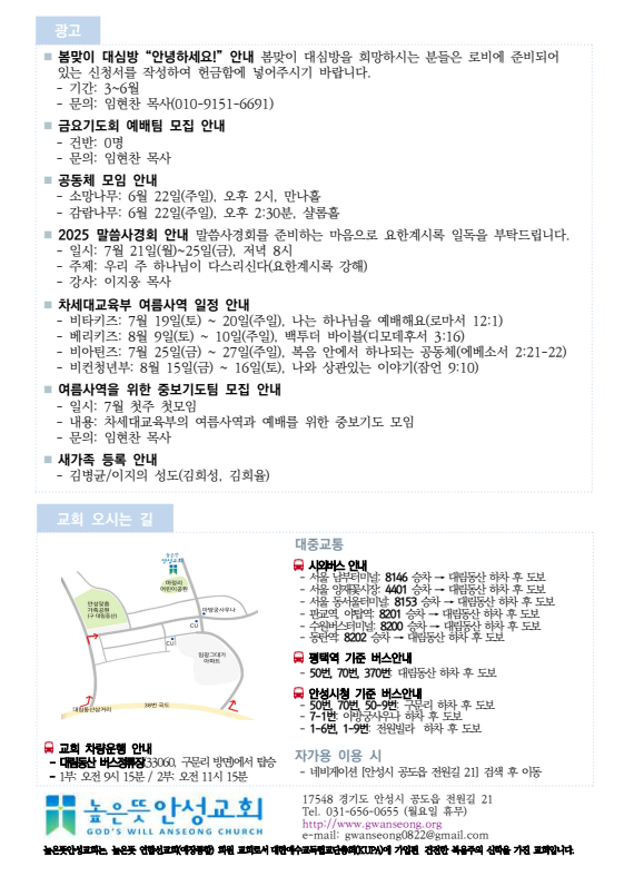 2025년 6월 22일 주보 2025.06.22 08:44 소식/교회주보 2025.06.22 주보.pdf 0.23MB 공유하기 게시글 관리 높은뜻 안성교회 '소식 > 교회주보' 카테고리의 다른 글 2025년 7월 6일 주보 (0) 2025.07.05 2025년 6월 29일 주보 (0) 2025.06.27 2025년 6월 15일 주보 (0) 2025.06.13 2025년 6월 1일 주보 (0) 2025.05.31 2025년 5월 25일 주보 (0) 2025.05.24 댓글 공유하기 다른 글 댓글 이 글 공유하기 구독하기 구독하기 카카오톡 카카오톡 라인 라인 트위터 트위터 Facebook Facebook 카카오스토리 카카오스토리 밴드 밴드 네이버 블로그 네이버 블로그 Pocket Pocket Evernote Evernote 다른 글 2025년 7월 6일 주보 2025년 7월 6일 주보 2025.07.05 2025년 6월 29일 주보 2025년 6월 29일 주보 2025.06.27 2025년 6월 15일 주보 2025년 6월 15일 주보 2025.06.13 2025년 6월 1일 주보 2025년 6월 1일 주보 2025.05.31 다른 글 더 둘러보기
