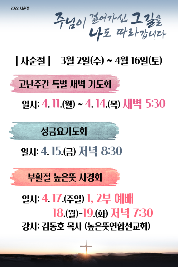 2022 사순절 안내 2022.02.26 00:04 소식/교회소식 * 2022 사순절: 3월 2일(수) ~ 4월 16일(토) * 고난주간 특별 새벽 기도회: 4월 11일(월) ~ 4월 14일(목) 새벽 5:30 * 성금요기도회: 4월 15일(금) 저녁 8:30 * 부활절 높은뜻 사경회 - 일시: 4월 17일(주일) 1,2부 예배, 18일(월)~19일(화) 저녁 7:30 - 강사: 김동호 목사 (높은뜻연합선교회) 공유하기 게시글 관리 높은뜻 안성교회 저작자표시 (새창열림) '소식 > 교회소식' 카테고리의 다른 글 중보기도 신청 안내 (0) 2022.02.26 2022 부활절 높은뜻 사경회 "하나님이 주인 되시는 교회" (0) 2022.02.26 코로나 19에 대한 높은뜻안성교회의 대응방침 (0) 2022.02.08 2022 새해인사♥ (0) 2022.01.07 높은뜻안성교회 2021 재정보고 & 2022 예산수립보고 (0) 2022.01.03 댓글 공유하기 다른 글 댓글 이 글 공유하기 구독하기 구독하기 카카오톡 카카오톡 라인 라인 트위터 트위터 Facebook Facebook 카카오스토리 카카오스토리 밴드 밴드 네이버 블로그 네이버 블로그 Pocket Pocket Evernote Evernote 다른 글 중보기도 신청 안내 중보기도 신청 안내 2022.02.26 2022 부활절 높은뜻 사경회 "하나님이 주인 되시는 교회" 2022 부활절 높은뜻 사경회 "하나님이 주인 되시는 교회" 2022.02.26 코로나 19에 대한 높은뜻안성교회의 대응방침 코로나 19에 대한 높은뜻안성교회의 대응방침 2022.02.08 2022 새해인사♥ 2022 새해인사♥ 2022.01.07 다른 글 더 둘러보기