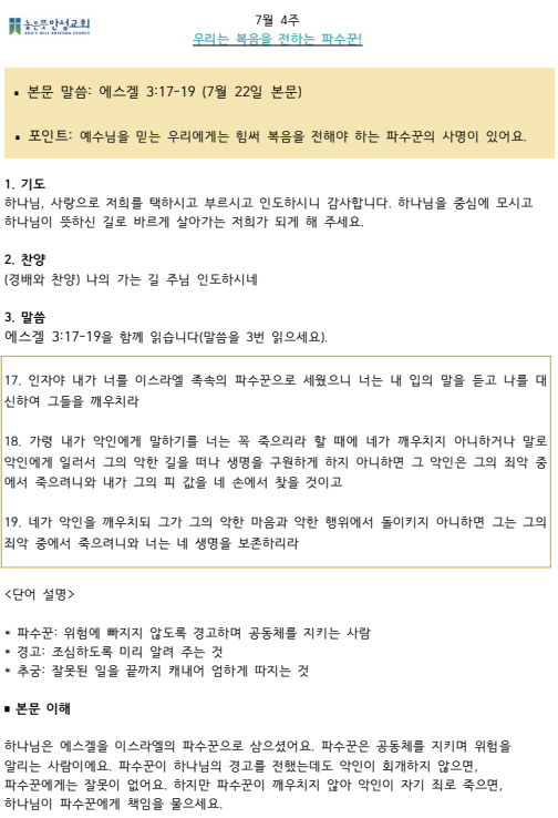 2025년 7월 넷째주 수요 가정예배 순서지 2025.07.19 20:51 소식/가정예배 순서지 2025년 7월 4주 가정예배.pdf 0.11MB 공유하기 게시글 관리 높은뜻 안성교회 '소식 > 가정예배 순서지' 카테고리의 다른 글 2025년 8월 둘째주 수요 가정예배 순서지 (1) 2025.08.02 2025년 8월 첫째주 수요 가정예배 순서지 (0) 2025.07.23 2025년 7월 셋째주 수요 가정예배 순서지 (0) 2025.07.11 2025년 7월 둘째주 수요 가정예배 순서지 (0) 2025.07.05 2025년 7월 첫째주 수요 가정예배 순서지 (0) 2025.06.28 댓글 공유하기 다른 글 댓글 이 글 공유하기 구독하기 구독하기 카카오톡 카카오톡 라인 라인 트위터 트위터 Facebook Facebook 카카오스토리 카카오스토리 밴드 밴드 네이버 블로그 네이버 블로그 Pocket Pocket Evernote Evernote 다른 글 2025년 8월 둘째주 수요 가정예배 순서지 2025년 8월 둘째주 수요 가정예배 순서지 2025.08.02 2025년 8월 첫째주 수요 가정예배 순서지 2025년 8월 첫째주 수요 가정예배 순서지 2025.07.23 2025년 7월 셋째주 수요 가정예배 순서지 2025년 7월 셋째주 수요 가정예배 순서지 2025.07.11 2025년 7월 둘째주 수요 가정예배 순서지 2025년 7월 둘째주 수요 가정예배 순서지 2025.07.05 다른 글 더 둘러보기