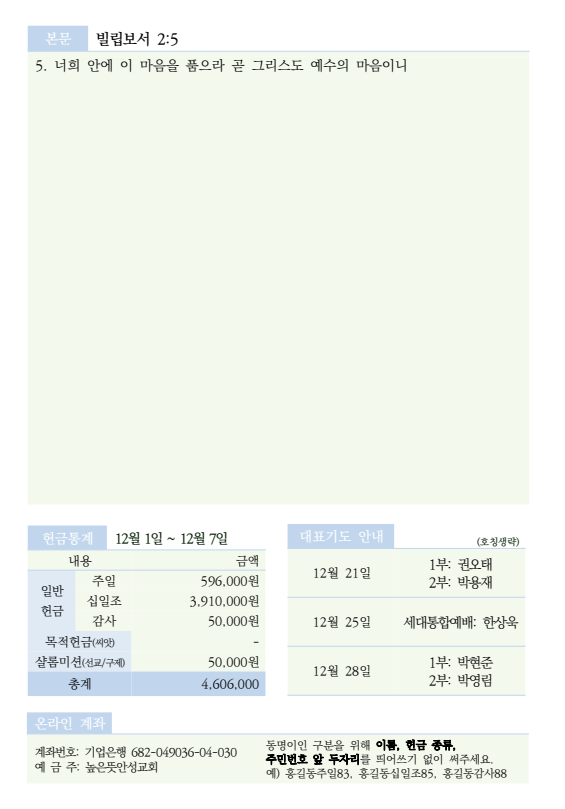 2025년 12월 14일 주보 2025.12.12 18:43 소식/교회주보 2025.12.14 주보.pdf 0.24MB 공유하기 게시글 관리 높은뜻 안성교회 '소식 > 교회주보' 카테고리의 다른 글 2025년 12월 28일 주보 (0) 2025.12.27 2025년 12월 21일 주보 (0) 2025.12.20 2025년 12월 7일 주보 (0) 2025.12.06 2025년 11월 30일 주보 (0) 2025.11.28 2025년 11월 23일 주보 (0) 2025.11.21 댓글 공유하기 다른 글 댓글 이 글 공유하기 구독하기 구독하기 카카오톡 카카오톡 라인 라인 트위터 트위터 Facebook Facebook 카카오스토리 카카오스토리 밴드 밴드 네이버 블로그 네이버 블로그 Pocket Pocket Evernote Evernote 다른 글 2025년 12월 28일 주보 2025년 12월 28일 주보 2025.12.27 2025년 12월 21일 주보 2025년 12월 21일 주보 2025.12.20 2025년 12월 7일 주보 2025년 12월 7일 주보 2025.12.06 2025년 11월 30일 주보 2025년 11월 30일 주보 2025.11.28 다른 글 더 둘러보기