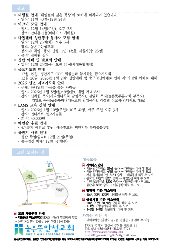 2025년 12월 14일 주보 2025.12.12 18:43 소식/교회주보 2025.12.14 주보.pdf 0.24MB 공유하기 게시글 관리 높은뜻 안성교회 '소식 > 교회주보' 카테고리의 다른 글 2025년 12월 28일 주보 (0) 2025.12.27 2025년 12월 21일 주보 (0) 2025.12.20 2025년 12월 7일 주보 (0) 2025.12.06 2025년 11월 30일 주보 (0) 2025.11.28 2025년 11월 23일 주보 (0) 2025.11.21 댓글 공유하기 다른 글 댓글 이 글 공유하기 구독하기 구독하기 카카오톡 카카오톡 라인 라인 트위터 트위터 Facebook Facebook 카카오스토리 카카오스토리 밴드 밴드 네이버 블로그 네이버 블로그 Pocket Pocket Evernote Evernote 다른 글 2025년 12월 28일 주보 2025년 12월 28일 주보 2025.12.27 2025년 12월 21일 주보 2025년 12월 21일 주보 2025.12.20 2025년 12월 7일 주보 2025년 12월 7일 주보 2025.12.06 2025년 11월 30일 주보 2025년 11월 30일 주보 2025.11.28 다른 글 더 둘러보기