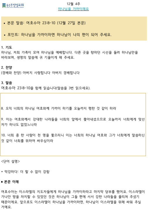 2025년 12월 넷째주 수요 가정예배 순서지 2025.12.19 23:59 소식/가정예배 순서지 2025년 12월 4주 가정예배.pdf 0.10MB 공유하기 게시글 관리 높은뜻 안성교회 '소식 > 가정예배 순서지' 카테고리의 다른 글 2026년 1월 둘째주 수요 가정예배 순서지 (0) 2026.01.03 2026년 1월 첫째주 수요 가정예배 순서지 (0) 2025.12.26 2025년 12월 셋째주 수요 가정예배 순서지 (0) 2025.12.13 2025년 12월 둘째주 수요 가정예배 순서지 (0) 2025.12.07 2025년 12월 첫째주 수요 가정예배 순서지 (0) 2025.11.29 댓글 공유하기 다른 글 댓글 이 글 공유하기 구독하기 구독하기 카카오톡 카카오톡 라인 라인 트위터 트위터 Facebook Facebook 카카오스토리 카카오스토리 밴드 밴드 네이버 블로그 네이버 블로그 Pocket Pocket Evernote Evernote 다른 글 2026년 1월 둘째주 수요 가정예배 순서지 2026년 1월 둘째주 수요 가정예배 순서지 2026.01.03 2026년 1월 첫째주 수요 가정예배 순서지 2026년 1월 첫째주 수요 가정예배 순서지 2025.12.26 2025년 12월 셋째주 수요 가정예배 순서지 2025년 12월 셋째주 수요 가정예배 순서지 2025.12.13 2025년 12월 둘째주 수요 가정예배 순서지 2025년 12월 둘째주 수요 가정예배 순서지 2025.12.07 다른 글 더 둘러보기