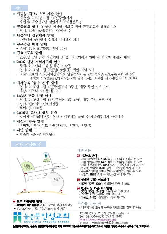 2025년 12월 28일 주보 2025.12.27 17:19 소식/교회주보 2025.12.28 주보.pdf 0.25MB 공유하기 게시글 관리 높은뜻 안성교회 '소식 > 교회주보' 카테고리의 다른 글 2025년 12월 21일 주보 (0) 2025.12.20 2025년 12월 14일 주보 (0) 2025.12.12 2025년 12월 7일 주보 (0) 2025.12.06 2025년 11월 30일 주보 (0) 2025.11.28 2025년 11월 23일 주보 (0) 2025.11.21 댓글 공유하기 다른 글 댓글 이 글 공유하기 구독하기 구독하기 카카오톡 카카오톡 라인 라인 트위터 트위터 Facebook Facebook 카카오스토리 카카오스토리 밴드 밴드 네이버 블로그 네이버 블로그 Pocket Pocket Evernote Evernote 다른 글 2025년 12월 21일 주보 2025년 12월 21일 주보 2025.12.20 2025년 12월 14일 주보 2025년 12월 14일 주보 2025.12.12 2025년 12월 7일 주보 2025년 12월 7일 주보 2025.12.06 2025년 11월 30일 주보 2025년 11월 30일 주보 2025.11.28 다른 글 더 둘러보기