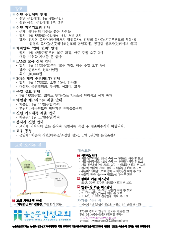 2026년 1월 4일 주보 2026.01.03 21:30 소식/교회주보 2026.1.4 주보.pdf 0.26MB 공유하기 게시글 관리 높은뜻 안성교회 '소식 > 교회주보' 카테고리의 다른 글 2026년 1월 18일 주보 (0) 2026.01.17 2026년 1월 11일 주보 (0) 2026.01.10 2025년 12월 28일 주보 (0) 2025.12.27 2025년 12월 21일 주보 (0) 2025.12.20 2025년 12월 14일 주보 (0) 2025.12.12 댓글 공유하기 다른 글 댓글 이 글 공유하기 구독하기 구독하기 카카오톡 카카오톡 라인 라인 트위터 트위터 Facebook Facebook 카카오스토리 카카오스토리 밴드 밴드 네이버 블로그 네이버 블로그 Pocket Pocket Evernote Evernote 다른 글 2026년 1월 18일 주보 2026년 1월 18일 주보 2026.01.17 2026년 1월 11일 주보 2026년 1월 11일 주보 2026.01.10 2025년 12월 28일 주보 2025년 12월 28일 주보 2025.12.27 2025년 12월 21일 주보 2025년 12월 21일 주보 2025.12.20 다른 글 더 둘러보기