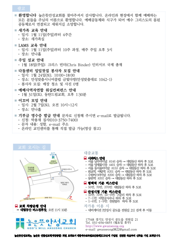 2026년 1월 18일 주보 2026.01.17 13:43 소식/교회주보 2026.1.18 주보 (1).pdf 0.25MB 공유하기 게시글 관리 높은뜻 안성교회 '소식 > 교회주보' 카테고리의 다른 글 2026년 2월 1일 주보 (0) 2026.01.31 2026년 1월 25일 주보 (0) 2026.01.24 2026년 1월 11일 주보 (0) 2026.01.10 2026년 1월 4일 주보 (0) 2026.01.03 2025년 12월 28일 주보 (0) 2025.12.27 댓글 공유하기 다른 글 댓글 이 글 공유하기 구독하기 구독하기 카카오톡 카카오톡 라인 라인 트위터 트위터 Facebook Facebook 카카오스토리 카카오스토리 밴드 밴드 네이버 블로그 네이버 블로그 Pocket Pocket Evernote Evernote 다른 글 2026년 2월 1일 주보 2026년 2월 1일 주보 2026.01.31 2026년 1월 25일 주보 2026년 1월 25일 주보 2026.01.24 2026년 1월 11일 주보 2026년 1월 11일 주보 2026.01.10 2026년 1월 4일 주보 2026년 1월 4일 주보 2026.01.03 다른 글 더 둘러보기