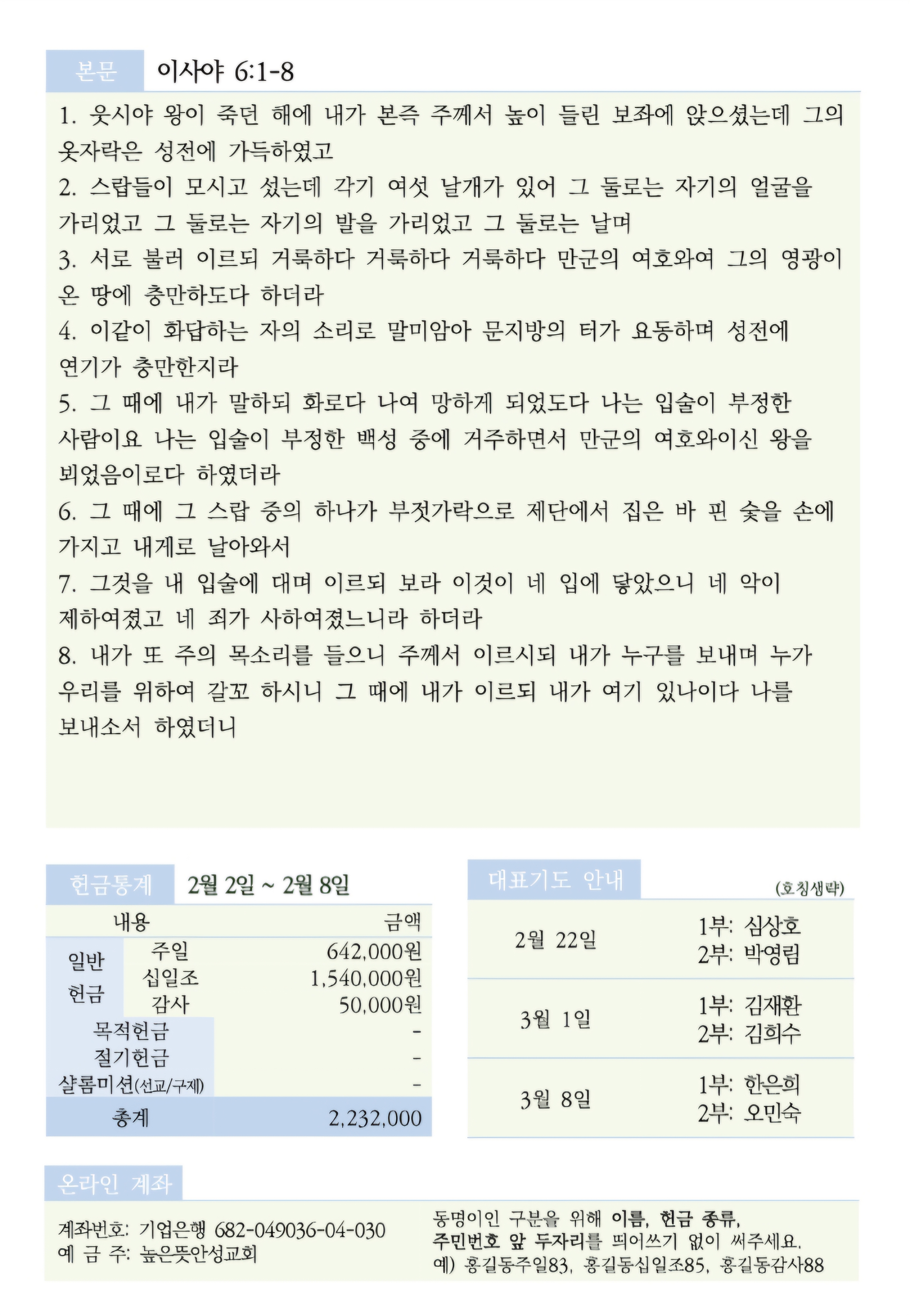 2026년 2월 15일 주보 2026.02.15 09:45 소식/교회소식 2026.2.15 주보.pdf 0.29MB 공유하기 게시글 관리 높은뜻 안성교회 '소식 > 교회소식' 카테고리의 다른 글 [상례안내] 소망나무 조정민 집사(이승근 집사)의 부친 故 조성구 집사 소천 (0) 2025.09.20 2025년 6월 8일 주보 (0) 2025.06.07 2024년 운영성과표 (0) 2025.02.02 2025년 공동의회 결과 공지(2025년 예산 결의) (0) 2025.01.11 2024년 높은뜻안성교회 안수집사/권사 임직예식 (0) 2024.11.23 댓글 공유하기 다른 글 댓글 이 글 공유하기 구독하기 구독하기 카카오톡 카카오톡 라인 라인 트위터 트위터 Facebook Facebook 카카오스토리 카카오스토리 밴드 밴드 네이버 블로그 네이버 블로그 Pocket Pocket Evernote Evernote 다른 글 [상례안내] 소망나무 조정민 집사(이승근 집사)의 부친 故 조성구 집사 소천 [상례안내] 소망나무 조정민 집사(이승근 집사)의 부친 故 조성구 집사 소천 2025.09.20 2025년 6월 8일 주보 2025년 6월 8일 주보 2025.06.07 2024년 운영성과표 2024년 운영성과표 2025.02.02 2025년 공동의회 결과 공지(2025년 예산 결의) 2025년 공동의회 결과 공지(2025년 예산 결의) 2025.01.11 다른 글 더 둘러보기