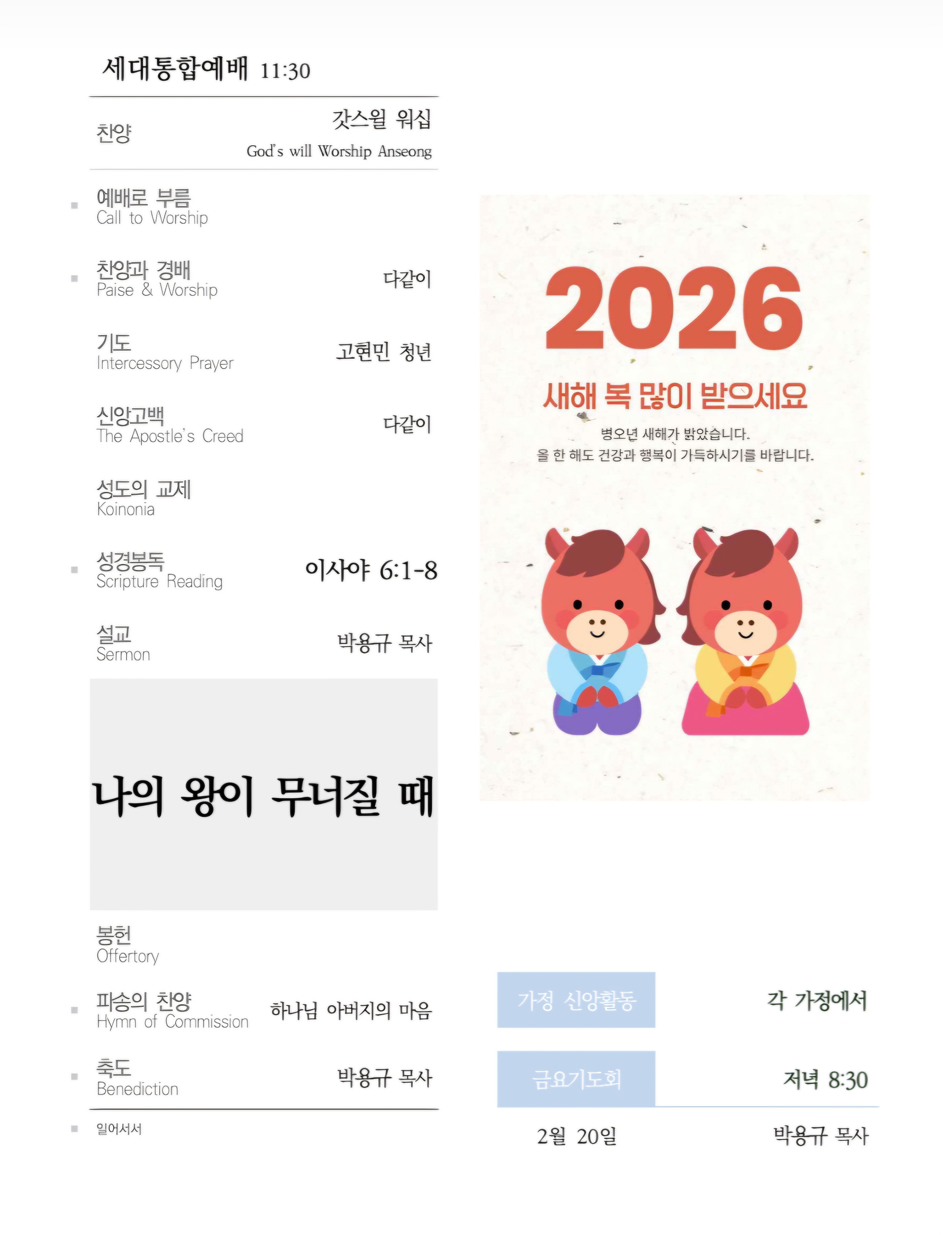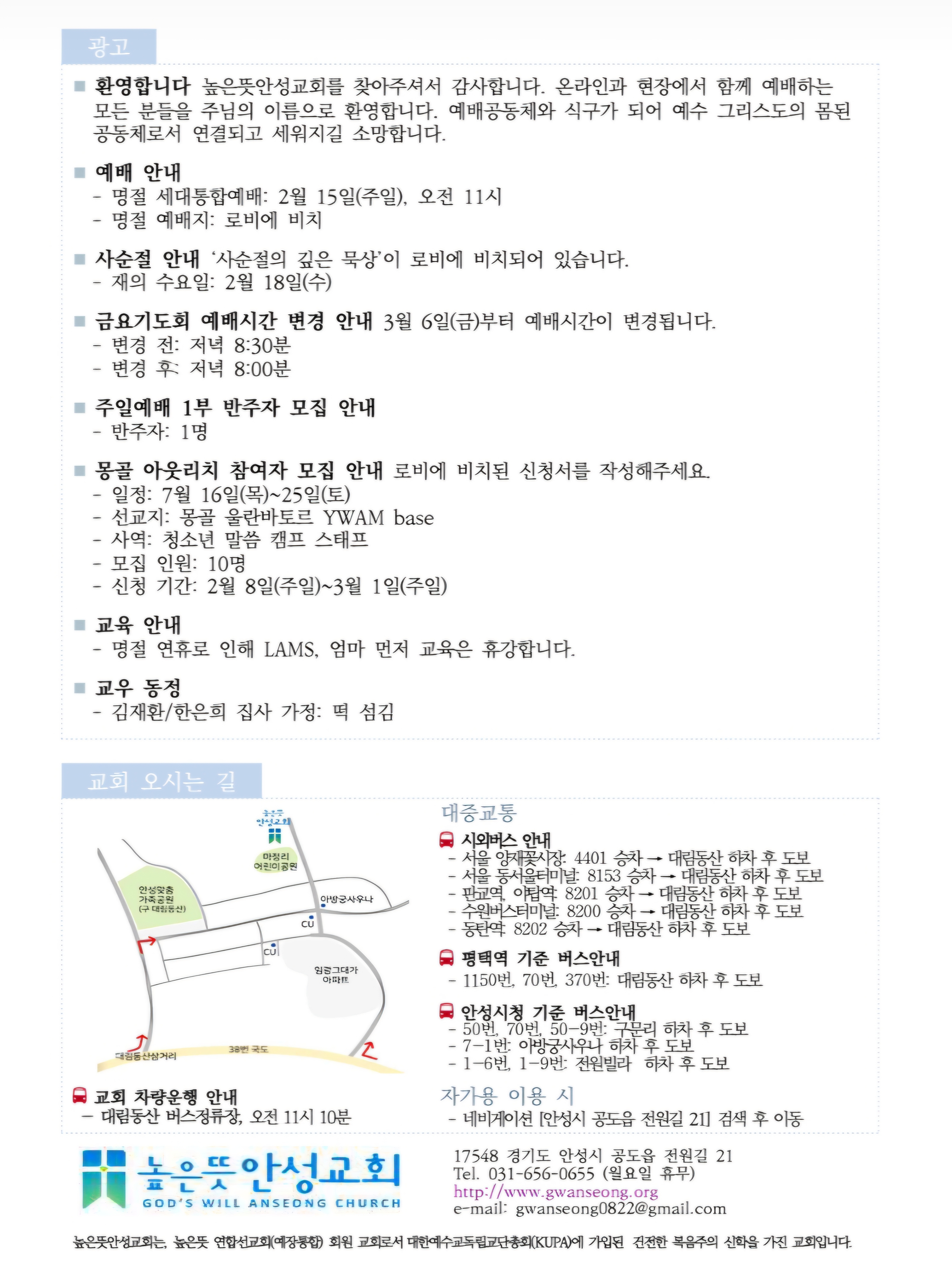 2026년 2월 15일 주보 2026.02.15 09:45 소식/교회소식 2026.2.15 주보.pdf 0.29MB 공유하기 게시글 관리 높은뜻 안성교회 '소식 > 교회소식' 카테고리의 다른 글 [상례안내] 소망나무 조정민 집사(이승근 집사)의 부친 故 조성구 집사 소천 (0) 2025.09.20 2025년 6월 8일 주보 (0) 2025.06.07 2024년 운영성과표 (0) 2025.02.02 2025년 공동의회 결과 공지(2025년 예산 결의) (0) 2025.01.11 2024년 높은뜻안성교회 안수집사/권사 임직예식 (0) 2024.11.23 댓글 공유하기 다른 글 댓글 이 글 공유하기 구독하기 구독하기 카카오톡 카카오톡 라인 라인 트위터 트위터 Facebook Facebook 카카오스토리 카카오스토리 밴드 밴드 네이버 블로그 네이버 블로그 Pocket Pocket Evernote Evernote 다른 글 [상례안내] 소망나무 조정민 집사(이승근 집사)의 부친 故 조성구 집사 소천 [상례안내] 소망나무 조정민 집사(이승근 집사)의 부친 故 조성구 집사 소천 2025.09.20 2025년 6월 8일 주보 2025년 6월 8일 주보 2025.06.07 2024년 운영성과표 2024년 운영성과표 2025.02.02 2025년 공동의회 결과 공지(2025년 예산 결의) 2025년 공동의회 결과 공지(2025년 예산 결의) 2025.01.11 다른 글 더 둘러보기