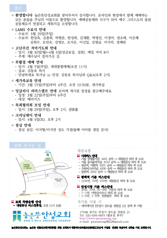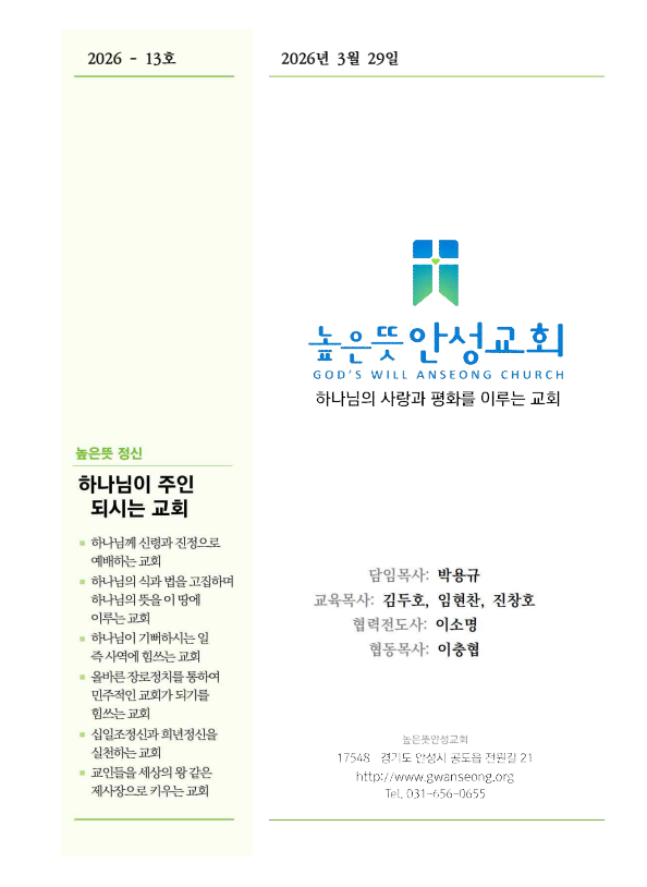 2026년 3월 29일 주보 2026.03.28 20:44 소식/교회주보 공유하기 게시글 관리 높은뜻 안성교회 '소식 > 교회주보' 카테고리의 다른 글 2026년 3월 22일 주보 (0) 2026.03.21 2026년 3월 15일 주보 (0) 2026.03.14 2026년 3월 8일 주보 (0) 2026.03.07 2026년 3월 1일 주보 (0) 2026.02.28 2026년 2월 22일 주보 (0) 2026.02.22 댓글 공유하기 다른 글 댓글 이 글 공유하기 구독하기 구독하기 카카오톡 카카오톡 라인 라인 트위터 트위터 Facebook Facebook 카카오스토리 카카오스토리 밴드 밴드 네이버 블로그 네이버 블로그 Pocket Pocket Evernote Evernote 다른 글 2026년 3월 22일 주보 2026년 3월 22일 주보 2026.03.21 2026년 3월 15일 주보 2026년 3월 15일 주보 2026.03.14 2026년 3월 8일 주보 2026년 3월 8일 주보 2026.03.07 2026년 3월 1일 주보 2026년 3월 1일 주보 2026.02.28 다른 글 더 둘러보기