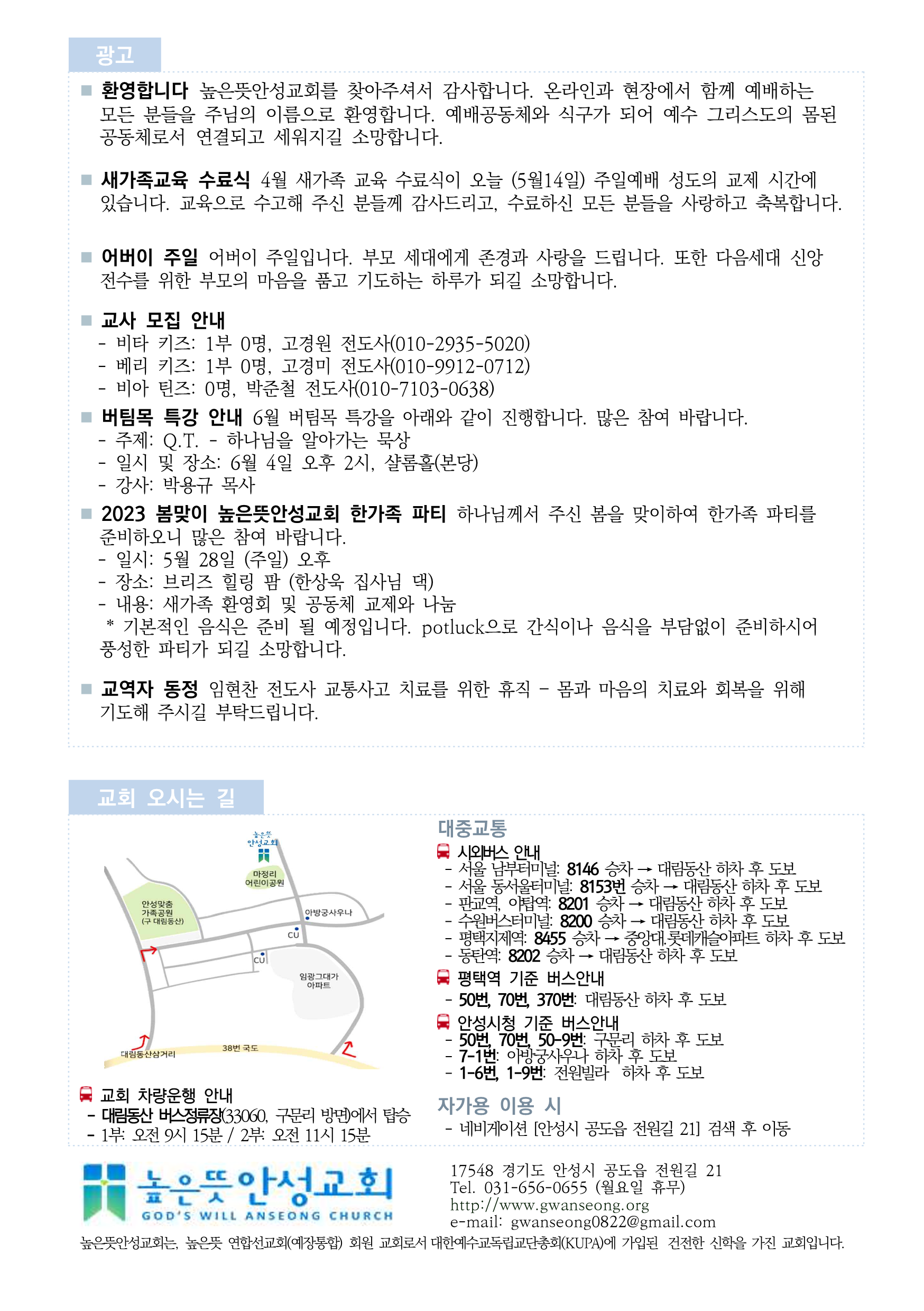 2023년 5월 14일 주보 2023.05.13 18:20 소식/교회주보 공유하기 게시글 관리 높은뜻 안성교회 저작자표시 (새창열림) '소식 > 교회주보' 카테고리의 다른 글 2023년 5월 28일 주보 (0) 2023.05.27 2023년 5월 21일 주보 (0) 2023.05.20 2023년 5월 7일 주보 (0) 2023.05.06 2023년 4월 30일 주보 (0) 2023.04.29 2023년 4월 23일 주보 (0) 2023.04.22 댓글 공유하기 다른 글 댓글 이 글 공유하기 구독하기 구독하기 카카오톡 카카오톡 라인 라인 트위터 트위터 Facebook Facebook 카카오스토리 카카오스토리 밴드 밴드 네이버 블로그 네이버 블로그 Pocket Pocket Evernote Evernote 다른 글 2023년 5월 28일 주보 2023년 5월 28일 주보 2023.05.27 2023년 5월 21일 주보 2023년 5월 21일 주보 2023.05.20 2023년 5월 7일 주보 2023년 5월 7일 주보 2023.05.06 2023년 4월 30일 주보 2023년 4월 30일 주보 2023.04.29 다른 글 더 둘러보기