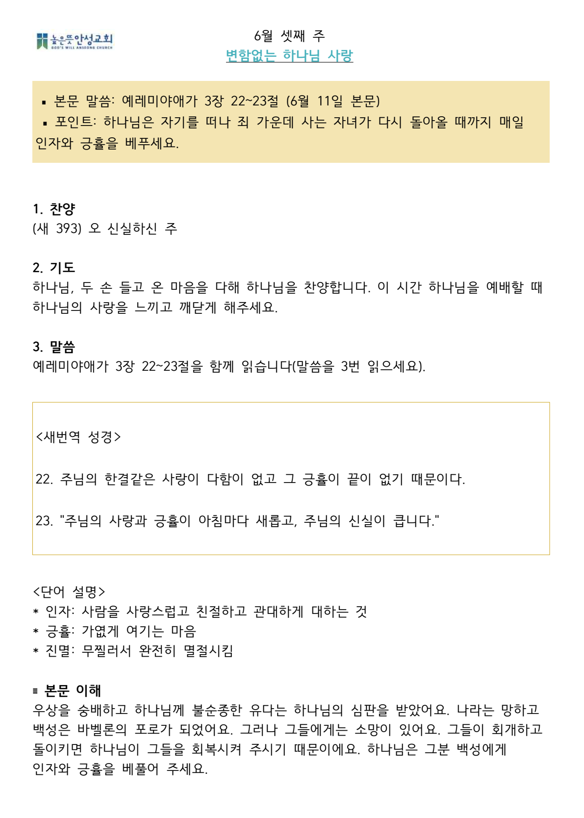 2023년 6월 셋째주 수요 가정예배 순서지 2023.06.10 15:49 소식/가정예배 순서지 2023. 6월 3주 가정예배.pdf 0.09MB 공유하기 게시글 관리 높은뜻 안성교회 저작자표시 (새창열림) '소식 > 가정예배 순서지' 카테고리의 다른 글 2023년 7월 첫째주 수요 가정예배 순서지 (0) 2023.06.24 2023년 6월 넷째주 수요 가정예배 순서지 (0) 2023.06.17 2023년 6월 둘째주 수요 가정예배 순서지 (0) 2023.06.04 2023년 5월 마지막주/ 6월 첫째주 수요 가정예배 순서지 (0) 2023.05.27 2023년 5월 넷째주 수요 가정예배 순서지 (0) 2023.05.20 댓글 공유하기 다른 글 댓글 이 글 공유하기 구독하기 구독하기 카카오톡 카카오톡 라인 라인 트위터 트위터 Facebook Facebook 카카오스토리 카카오스토리 밴드 밴드 네이버 블로그 네이버 블로그 Pocket Pocket Evernote Evernote 다른 글 2023년 7월 첫째주 수요 가정예배 순서지 2023년 7월 첫째주 수요 가정예배 순서지 2023.06.24 2023년 6월 넷째주 수요 가정예배 순서지 2023년 6월 넷째주 수요 가정예배 순서지 2023.06.17 2023년 6월 둘째주 수요 가정예배 순서지 2023년 6월 둘째주 수요 가정예배 순서지 2023.06.04 2023년 5월 마지막주/ 6월 첫째주 수요 가정예배 순서지 2023년 5월 마지막주/ 6월 첫째주 수요 가정예배 순서지 2023.05.27 다른 글 더 둘러보기