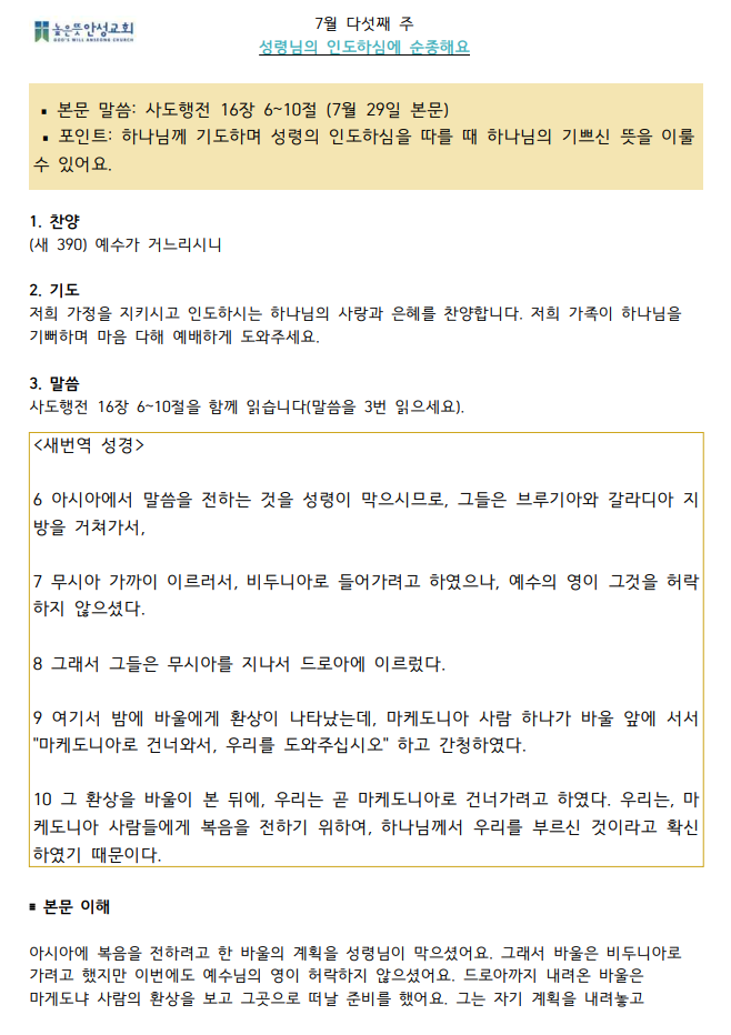 2023년 7월 다섯째주 수요 가정예배 순서지 2023.07.22 13:42 소식/가정예배 순서지 2023년 7월 5주 가정예배.pdf 0.10MB 공유하기 게시글 관리 높은뜻 안성교회 저작자표시 (새창열림) '소식 > 가정예배 순서지' 카테고리의 다른 글 2023년 8월 둘째주 수요 가정예배 순서지 (0) 2023.08.05 2023년 8월 첫째주 수요 가정예배 순서지 (0) 2023.07.29 2023년 7월 넷째주 수요 가정예배 순서지 (0) 2023.07.14 2023년 7월 셋째주 수요 가정예배 순서지 (0) 2023.07.09 2023년 7월 둘째주 수요 가정예배 순서지 (0) 2023.06.30 댓글 공유하기 다른 글 댓글 이 글 공유하기 구독하기 구독하기 카카오톡 카카오톡 라인 라인 트위터 트위터 Facebook Facebook 카카오스토리 카카오스토리 밴드 밴드 네이버 블로그 네이버 블로그 Pocket Pocket Evernote Evernote 다른 글 2023년 8월 둘째주 수요 가정예배 순서지 2023년 8월 둘째주 수요 가정예배 순서지 2023.08.05 2023년 8월 첫째주 수요 가정예배 순서지 2023년 8월 첫째주 수요 가정예배 순서지 2023.07.29 2023년 7월 넷째주 수요 가정예배 순서지 2023년 7월 넷째주 수요 가정예배 순서지 2023.07.14 2023년 7월 셋째주 수요 가정예배 순서지 2023년 7월 셋째주 수요 가정예배 순서지 2023.07.09 다른 글 더 둘러보기