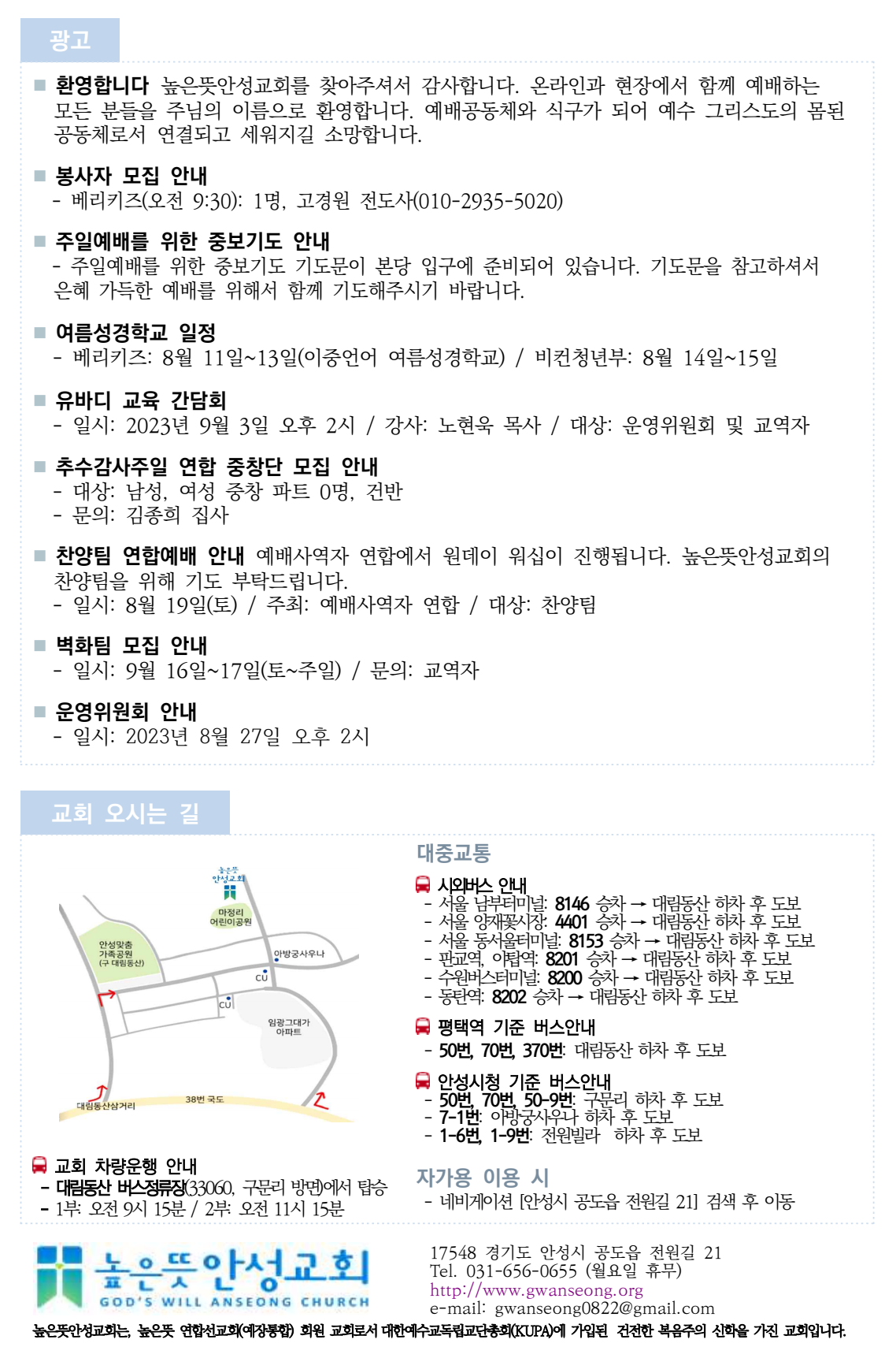 2023년 8월 13일 주보 2023.08.12 11:06 소식/교회주보 2023.08.13 주보.pdf 0.24MB 공유하기 게시글 관리 높은뜻 안성교회 저작자표시 (새창열림) '소식 > 교회주보' 카테고리의 다른 글 2023년 8월 27일 주보 (0) 2023.08.26 2023년 8월 20일 주보 (0) 2023.08.19 2023년 8월 6일 주보 (0) 2023.08.05 2023년 7월 30일 주보 (0) 2023.07.29 2023년 7월 23일 주보 (0) 2023.07.22 댓글 공유하기 다른 글 댓글 이 글 공유하기 구독하기 구독하기 카카오톡 카카오톡 라인 라인 트위터 트위터 Facebook Facebook 카카오스토리 카카오스토리 밴드 밴드 네이버 블로그 네이버 블로그 Pocket Pocket Evernote Evernote 다른 글 2023년 8월 27일 주보 2023년 8월 27일 주보 2023.08.26 2023년 8월 20일 주보 2023년 8월 20일 주보 2023.08.19 2023년 8월 6일 주보 2023년 8월 6일 주보 2023.08.05 2023년 7월 30일 주보 2023년 7월 30일 주보 2023.07.29 다른 글 더 둘러보기