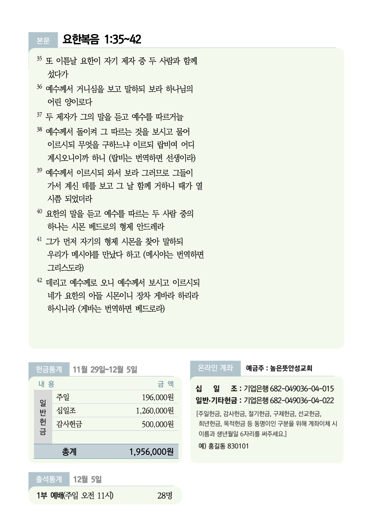 2021년 12월 12일 주보입니다. 2021.12.10 19:13 소식/교회주보 코로나 19 상황이 정말 좋지 않은 요즘입니다. 작년에 이어서 성탄을 조금은 차분히 지나게 되는 이 상황이 마음이 좋지 않지만, 참된 성탄의 의미를 되새기며 나라와 민족을 위해 기도하는 주일이 되길 소원합니다. 공유하기 게시글 관리 높은뜻 안성교회 저작자표시 (새창열림) '소식 > 교회주보' 카테고리의 다른 글 2021년 성탄 축하예배 순서지 (0) 2021.12.24 2021년 12월 19일 주보입니다 (0) 2021.12.19 2021년 12월 5일 높은뜻 안성교회 주보 (0) 2021.12.04 2021년 11월 28일 높은뜻안성교회 주보 (0) 2021.11.27 2021년 11월 21일 주보 (0) 2021.11.20 댓글 공유하기 다른 글 댓글 이 글 공유하기 구독하기 구독하기 카카오톡 카카오톡 라인 라인 트위터 트위터 Facebook Facebook 카카오스토리 카카오스토리 밴드 밴드 네이버 블로그 네이버 블로그 Pocket Pocket Evernote Evernote 다른 글 2021년 성탄 축하예배 순서지 2021년 성탄 축하예배 순서지 2021.12.24 2021년 12월 19일 주보입니다 2021년 12월 19일 주보입니다 2021.12.19 2021년 12월 5일 높은뜻 안성교회 주보 2021년 12월 5일 높은뜻 안성교회 주보 2021.12.04 2021년 11월 28일 높은뜻안성교회 주보 2021년 11월 28일 높은뜻안성교회 주보 2021.11.27 다른 글 더 둘러보기