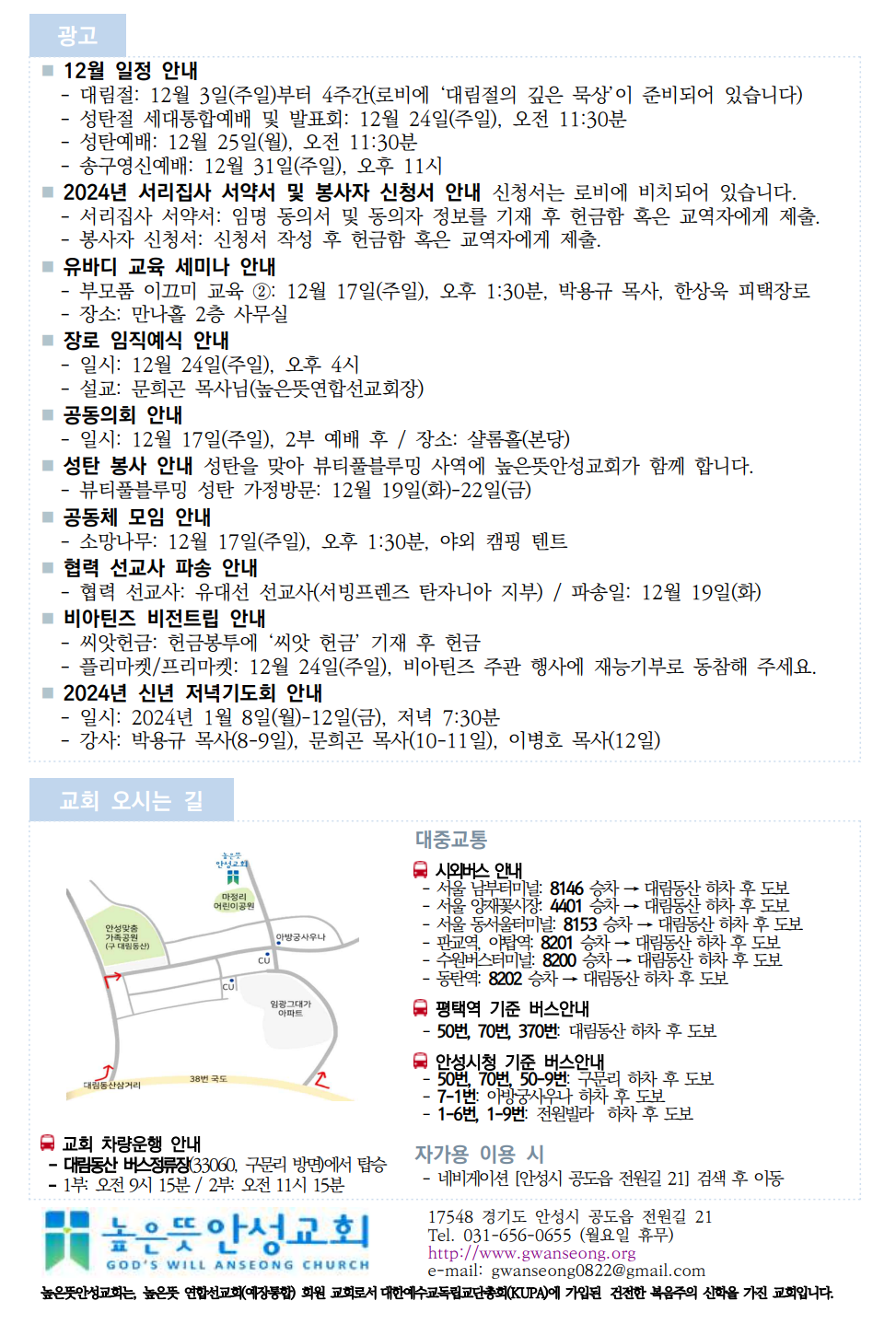 2023년 12월 17일 주보 2023.12.16 13:45 소식/교회주보 2023.12.17 주보.pdf 0.24MB 공유하기 게시글 관리 높은뜻 안성교회 '소식 > 교회주보' 카테고리의 다른 글 2023년 12월 31일 주보 (0) 2023.12.30 2023년 12월 24일 주보 (0) 2023.12.23 2023년 12월 10일 주보 (0) 2023.12.09 2023년 12월 3일 주보 (0) 2023.12.02 2023년 11월 26일 주보 (0) 2023.11.25 댓글 공유하기 다른 글 댓글 이 글 공유하기 구독하기 구독하기 카카오톡 카카오톡 라인 라인 트위터 트위터 Facebook Facebook 카카오스토리 카카오스토리 밴드 밴드 네이버 블로그 네이버 블로그 Pocket Pocket Evernote Evernote 다른 글 2023년 12월 31일 주보 2023년 12월 31일 주보 2023.12.30 2023년 12월 24일 주보 2023년 12월 24일 주보 2023.12.23 2023년 12월 10일 주보 2023년 12월 10일 주보 2023.12.09 2023년 12월 3일 주보 2023년 12월 3일 주보 2023.12.02 다른 글 더 둘러보기