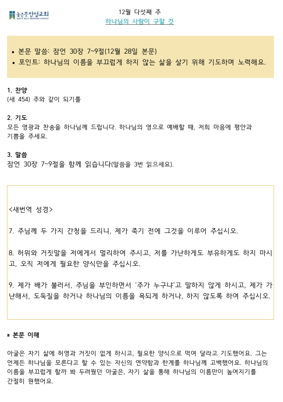 2023년 12월 다섯째주 수요 가정예배 순서지 2023.12.23 14:05 소식/가정예배 순서지 2023년 12월 5주 가정예배.pdf 0.09MB 공유하기 게시글 관리 높은뜻 안성교회 '소식 > 가정예배 순서지' 카테고리의 다른 글 2024년 1월 둘째주 수요 가정예배 순서지 (0) 2024.01.06 2024년 1월 첫째주 수요 가정예배 순서지 (0) 2023.12.30 2023년 12월 넷째주 수요 가정예배 순서지 (0) 2023.12.16 2023년 12월 둘째주 수요 가정예배 순서지 (0) 2023.12.02 2023년 12월 첫째주 수요 가정예배 순서지 (0) 2023.11.25 댓글 공유하기 다른 글 댓글 이 글 공유하기 구독하기 구독하기 카카오톡 카카오톡 라인 라인 트위터 트위터 Facebook Facebook 카카오스토리 카카오스토리 밴드 밴드 네이버 블로그 네이버 블로그 Pocket Pocket Evernote Evernote 다른 글 2024년 1월 둘째주 수요 가정예배 순서지 2024년 1월 둘째주 수요 가정예배 순서지 2024.01.06 2024년 1월 첫째주 수요 가정예배 순서지 2024년 1월 첫째주 수요 가정예배 순서지 2023.12.30 2023년 12월 넷째주 수요 가정예배 순서지 2023년 12월 넷째주 수요 가정예배 순서지 2023.12.16 2023년 12월 둘째주 수요 가정예배 순서지 2023년 12월 둘째주 수요 가정예배 순서지 2023.12.02 다른 글 더 둘러보기
