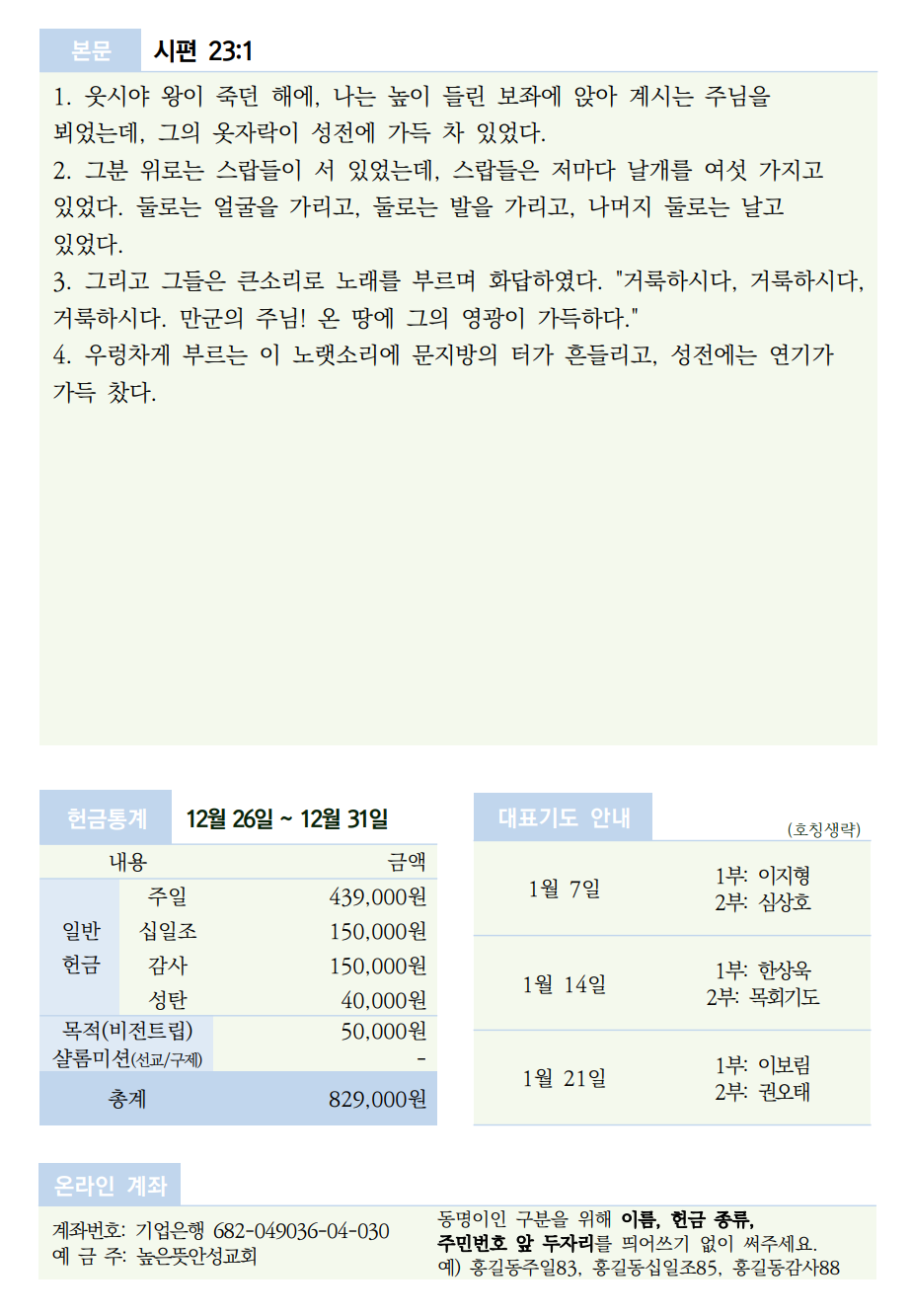 2024년 1월 7일 주보 2024.01.06 16:50 소식/교회주보 2024.01.07 주보.pdf 0.23MB 공유하기 게시글 관리 높은뜻 안성교회 '소식 > 교회주보' 카테고리의 다른 글 높은뜻안성교회 2024년 1월 21일 주보 (0) 2024.01.26 2024년 1월 14일 주보 (0) 2024.01.14 2023년 12월 31일 주보 (0) 2023.12.30 2023년 12월 24일 주보 (0) 2023.12.23 2023년 12월 17일 주보 (0) 2023.12.16 댓글 공유하기 다른 글 댓글 이 글 공유하기 구독하기 구독하기 카카오톡 카카오톡 라인 라인 트위터 트위터 Facebook Facebook 카카오스토리 카카오스토리 밴드 밴드 네이버 블로그 네이버 블로그 Pocket Pocket Evernote Evernote 다른 글 높은뜻안성교회 2024년 1월 21일 주보 높은뜻안성교회 2024년 1월 21일 주보 2024.01.26 2024년 1월 14일 주보 2024년 1월 14일 주보 2024.01.14 2023년 12월 31일 주보 2023년 12월 31일 주보 2023.12.30 2023년 12월 24일 주보 2023년 12월 24일 주보 2023.12.23 다른 글 더 둘러보기