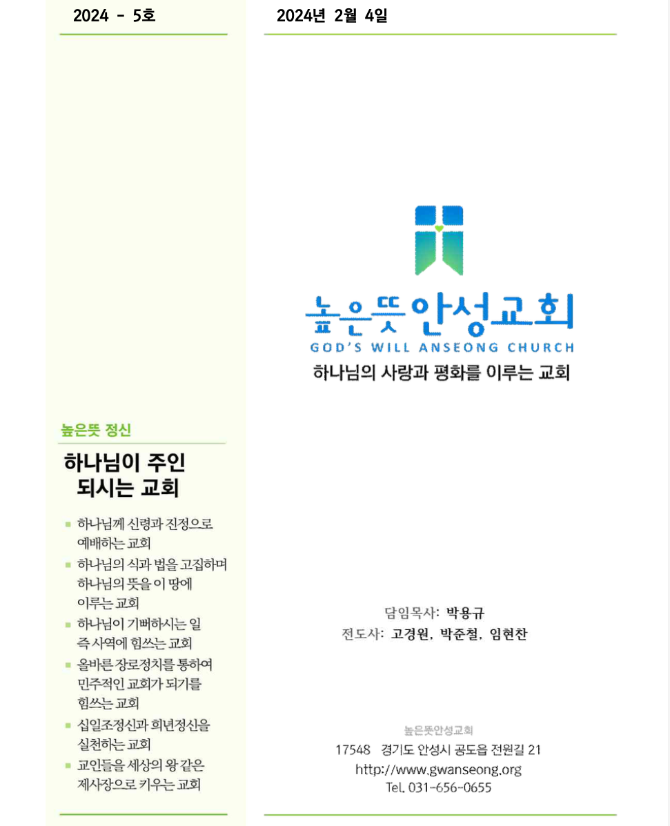 2024년 2월 4일 주일예배 주보입니다. 2024.02.02 18:09 소식/교회주보 2024.02.04 주보 (1).pdf 0.23MB 공유하기 게시글 관리 높은뜻 안성교회 '소식 > 교회주보' 카테고리의 다른 글 2024년 2월 18일 주보입니다. (0) 2024.02.16 2024년 2월 11일 주보 (0) 2024.02.09 높은뜻안성교회 2024년 1월 28일 주보입니다. (0) 2024.01.27 높은뜻안성교회 2024년 1월 21일 주보 (0) 2024.01.26 2024년 1월 14일 주보 (0) 2024.01.14 댓글 공유하기 다른 글 댓글 이 글 공유하기 구독하기 구독하기 카카오톡 카카오톡 라인 라인 트위터 트위터 Facebook Facebook 카카오스토리 카카오스토리 밴드 밴드 네이버 블로그 네이버 블로그 Pocket Pocket Evernote Evernote 다른 글 2024년 2월 18일 주보입니다. 2024년 2월 18일 주보입니다. 2024.02.16 2024년 2월 11일 주보 2024년 2월 11일 주보 2024.02.09 높은뜻안성교회 2024년 1월 28일 주보입니다. 높은뜻안성교회 2024년 1월 28일 주보입니다. 2024.01.27 높은뜻안성교회 2024년 1월 21일 주보 높은뜻안성교회 2024년 1월 21일 주보 2024.01.26 다른 글 더 둘러보기