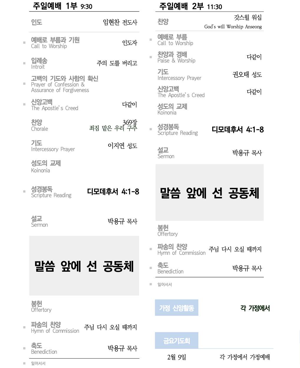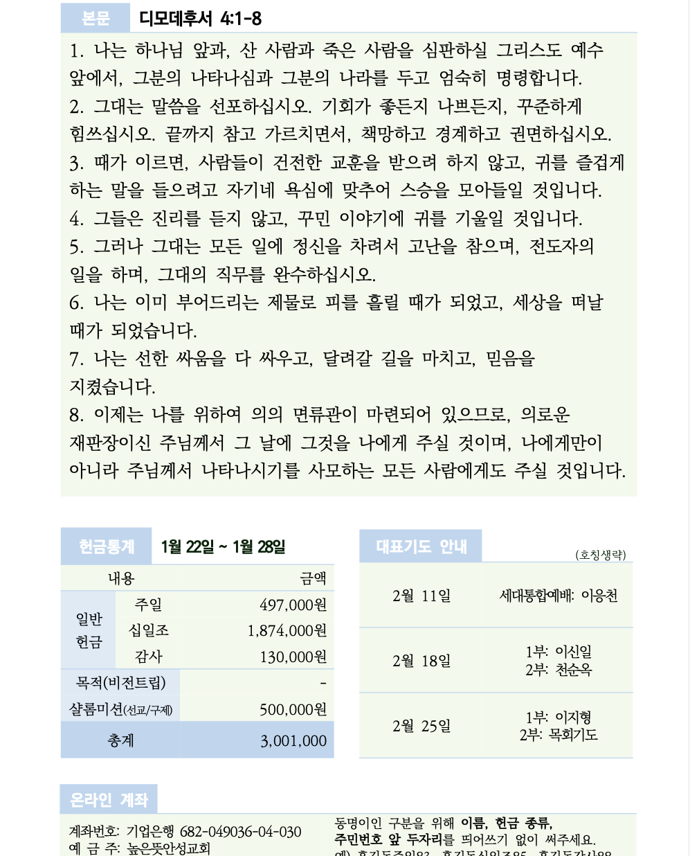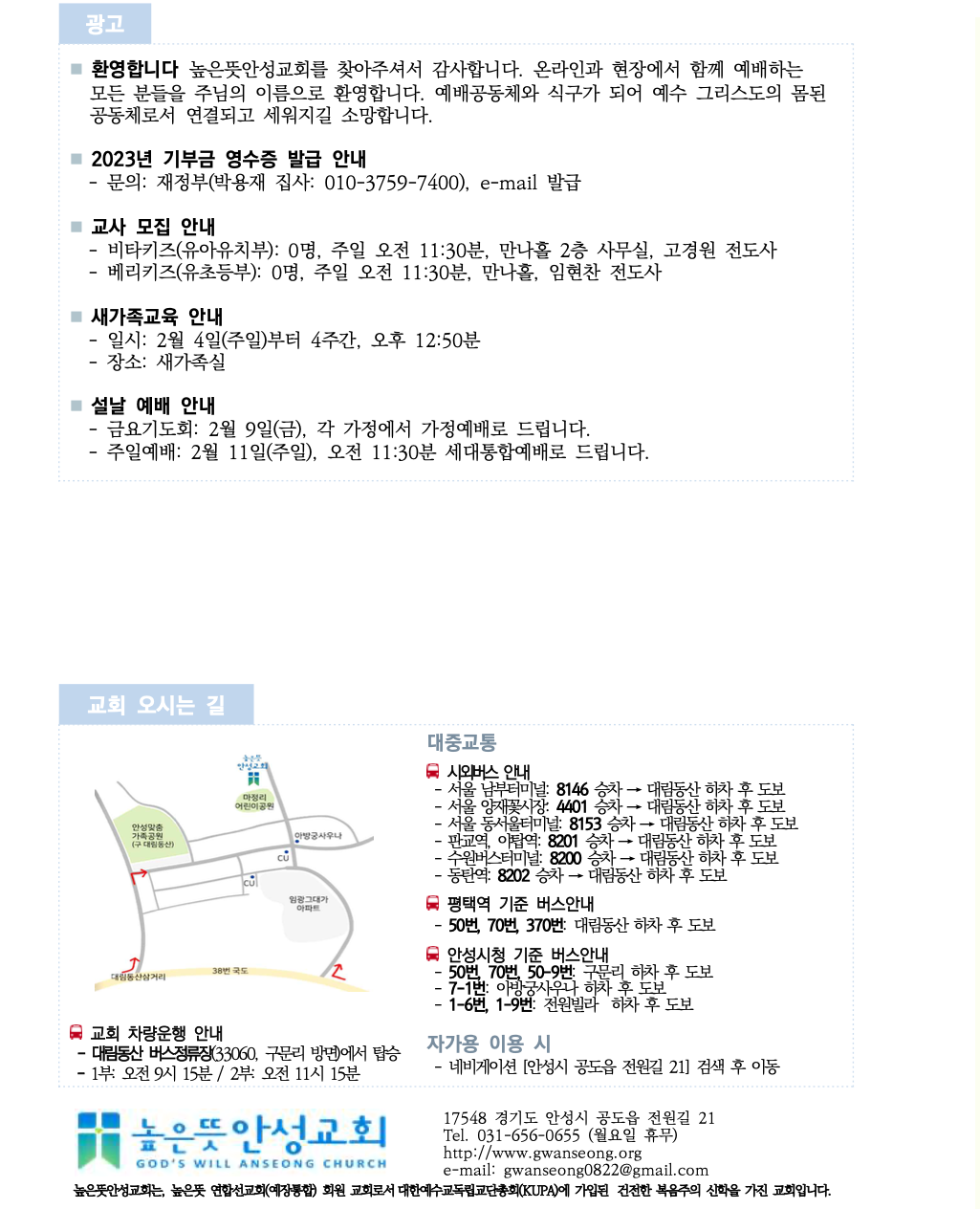 2024년 2월 4일 주일예배 주보입니다. 2024.02.02 18:09 소식/교회주보 2024.02.04 주보 (1).pdf 0.23MB 공유하기 게시글 관리 높은뜻 안성교회 '소식 > 교회주보' 카테고리의 다른 글 2024년 2월 18일 주보입니다. (0) 2024.02.16 2024년 2월 11일 주보 (0) 2024.02.09 높은뜻안성교회 2024년 1월 28일 주보입니다. (0) 2024.01.27 높은뜻안성교회 2024년 1월 21일 주보 (0) 2024.01.26 2024년 1월 14일 주보 (0) 2024.01.14 댓글 공유하기 다른 글 댓글 이 글 공유하기 구독하기 구독하기 카카오톡 카카오톡 라인 라인 트위터 트위터 Facebook Facebook 카카오스토리 카카오스토리 밴드 밴드 네이버 블로그 네이버 블로그 Pocket Pocket Evernote Evernote 다른 글 2024년 2월 18일 주보입니다. 2024년 2월 18일 주보입니다. 2024.02.16 2024년 2월 11일 주보 2024년 2월 11일 주보 2024.02.09 높은뜻안성교회 2024년 1월 28일 주보입니다. 높은뜻안성교회 2024년 1월 28일 주보입니다. 2024.01.27 높은뜻안성교회 2024년 1월 21일 주보 높은뜻안성교회 2024년 1월 21일 주보 2024.01.26 다른 글 더 둘러보기