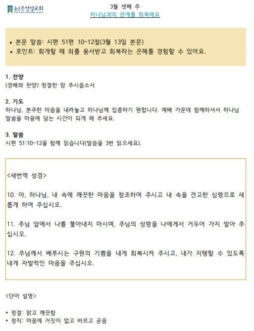 2024년 3월 셋째주 수요 가정예배 순서지 2024.03.16 02:29 소식/가정예배 순서지 2024년 3월 3주 가정예배 순서지.pdf 0.10MB 공유하기 게시글 관리 높은뜻 안성교회 '소식 > 가정예배 순서지' 카테고리의 다른 글 2024년 3월 다섯째주 수요 가정예배 순서지 (0) 2024.03.31 2024년 3월 넷째주 수요 가정예배 순서지 (0) 2024.03.23 2024년 3월 둘째주 수요 가정예배 순서지 (0) 2024.03.09 2024년 3월 첫째주 수요 가정예배 순서지 (0) 2024.03.02 2024년 2월 넷째주 수요 가정예배 순서지 (0) 2024.02.24 댓글 공유하기 다른 글 댓글 이 글 공유하기 구독하기 구독하기 카카오톡 카카오톡 라인 라인 트위터 트위터 Facebook Facebook 카카오스토리 카카오스토리 밴드 밴드 네이버 블로그 네이버 블로그 Pocket Pocket Evernote Evernote 다른 글 2024년 3월 다섯째주 수요 가정예배 순서지 2024년 3월 다섯째주 수요 가정예배 순서지 2024.03.31 2024년 3월 넷째주 수요 가정예배 순서지 2024년 3월 넷째주 수요 가정예배 순서지 2024.03.23 2024년 3월 둘째주 수요 가정예배 순서지 2024년 3월 둘째주 수요 가정예배 순서지 2024.03.09 2024년 3월 첫째주 수요 가정예배 순서지 2024년 3월 첫째주 수요 가정예배 순서지 2024.03.02 다른 글 더 둘러보기