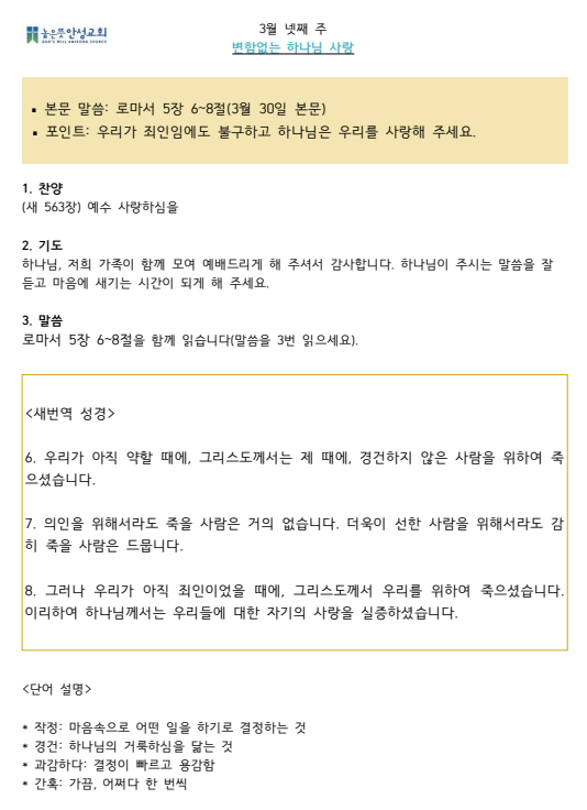 2024년 3월 다섯째주 수요 가정예배 순서지 2024.03.31 08:56 소식/가정예배 순서지 2024년 3월 5주 가정예배.pdf 0.10MB 공유하기 게시글 관리 높은뜻 안성교회 '소식 > 가정예배 순서지' 카테고리의 다른 글 2024년 4월 셋째주 수요 가정예배 순서지 (0) 2024.04.13 2024년 4월 첫째주 수요 가정예배 순서지 (0) 2024.04.05 2024년 3월 넷째주 수요 가정예배 순서지 (0) 2024.03.23 2024년 3월 셋째주 수요 가정예배 순서지 (0) 2024.03.16 2024년 3월 둘째주 수요 가정예배 순서지 (0) 2024.03.09 댓글 공유하기 다른 글 댓글 이 글 공유하기 구독하기 구독하기 카카오톡 카카오톡 라인 라인 트위터 트위터 Facebook Facebook 카카오스토리 카카오스토리 밴드 밴드 네이버 블로그 네이버 블로그 Pocket Pocket Evernote Evernote 다른 글 2024년 4월 셋째주 수요 가정예배 순서지 2024년 4월 셋째주 수요 가정예배 순서지 2024.04.13 2024년 4월 첫째주 수요 가정예배 순서지 2024년 4월 첫째주 수요 가정예배 순서지 2024.04.05 2024년 3월 넷째주 수요 가정예배 순서지 2024년 3월 넷째주 수요 가정예배 순서지 2024.03.23 2024년 3월 셋째주 수요 가정예배 순서지 2024년 3월 셋째주 수요 가정예배 순서지 2024.03.16 다른 글 더 둘러보기