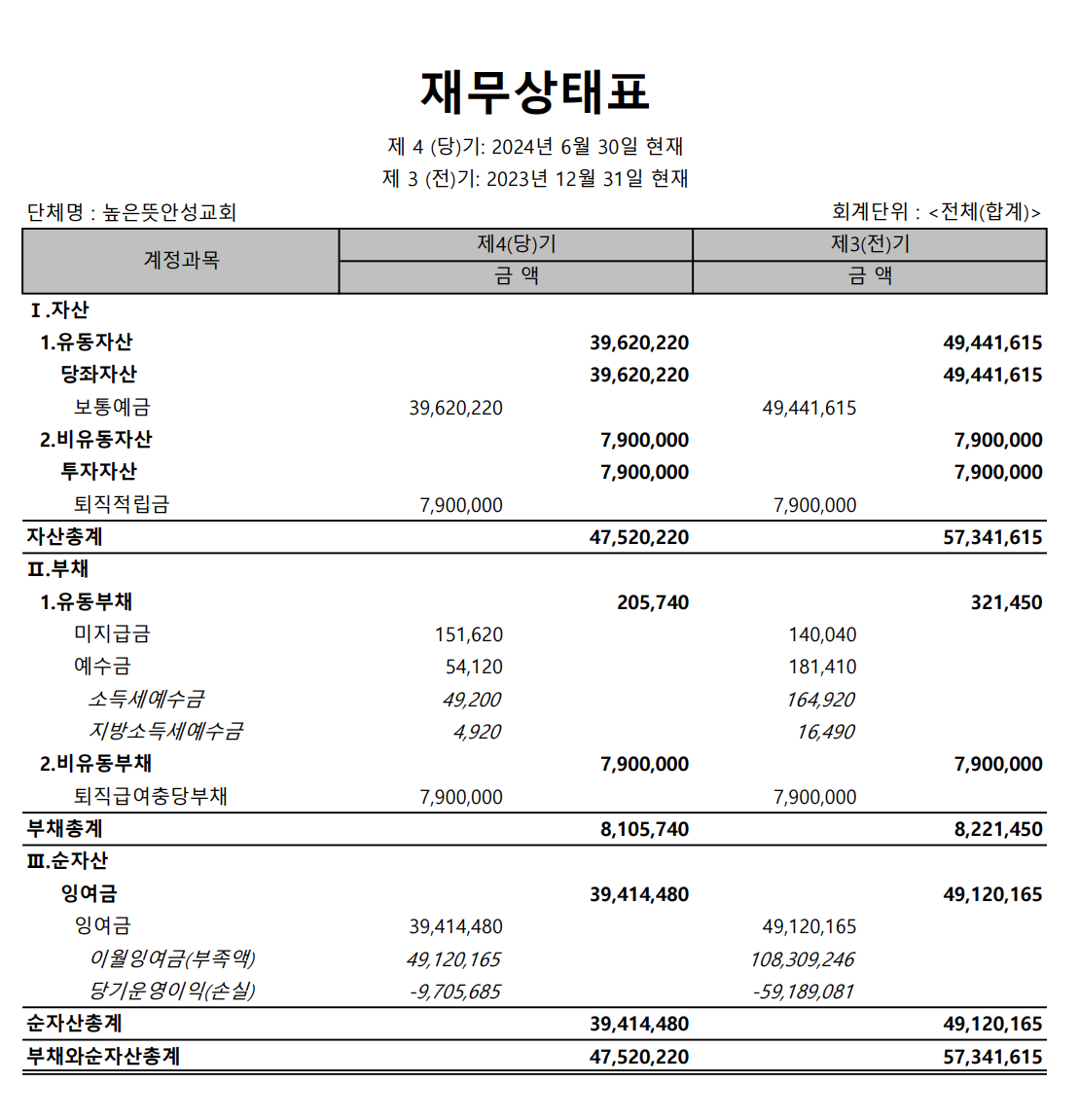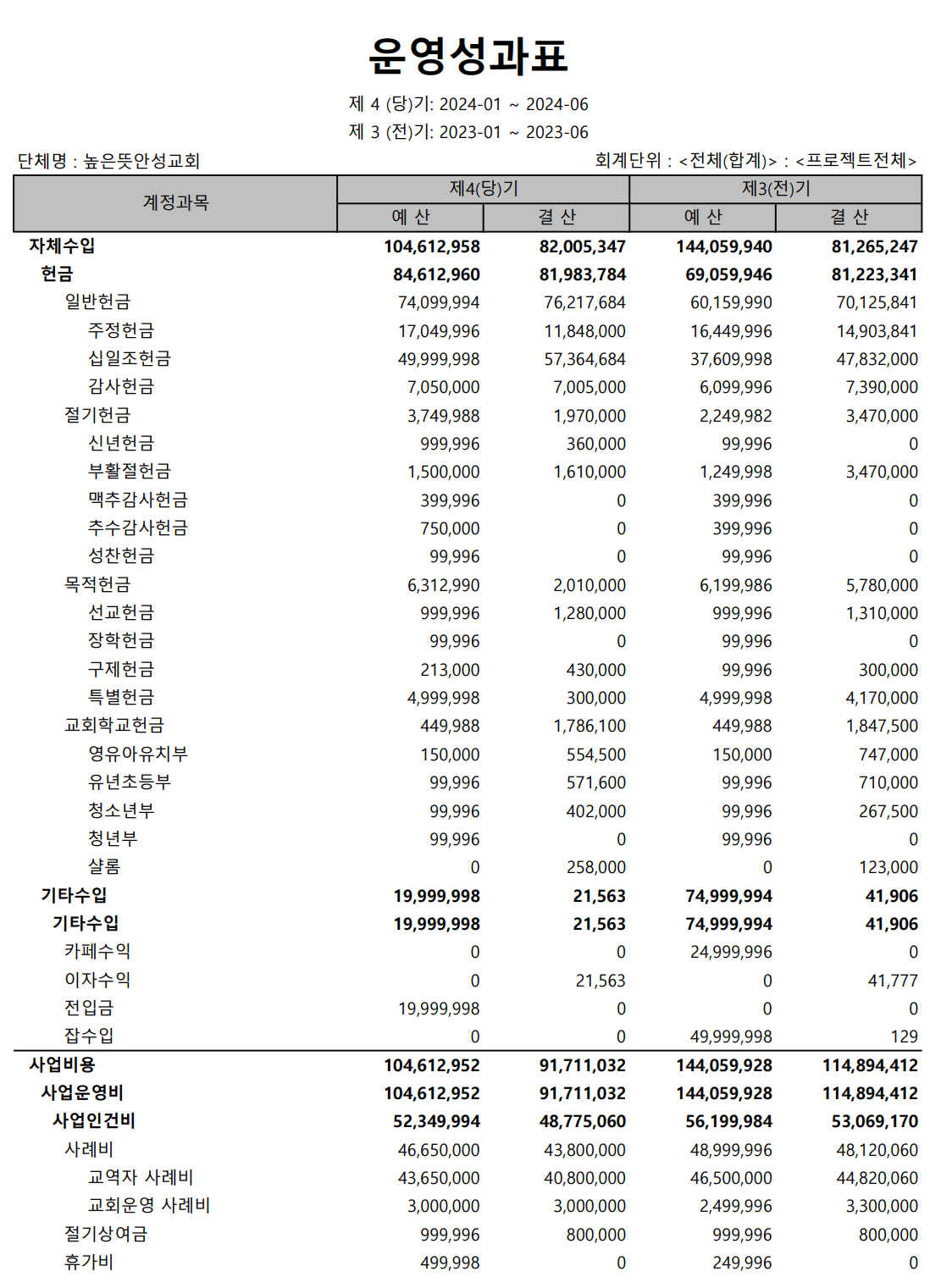 2024년 상반기 재정 결산서 안내 2024.08.10 17:34 소식/교회소식 높은뜻안성교회 2024년 상반기 재정 결산 안내입니다. 2024년 상반기 결산서.pdf 0.10MB 공유하기 게시글 관리 높은뜻 안성교회 '소식 > 교회소식' 카테고리의 다른 글 2025년 공동의회 결과 공지(2025년 예산 결의) (0) 2025.01.11 2024년 높은뜻안성교회 안수집사/권사 임직예식 (0) 2024.11.23 2023년 3분기 높은뜻안성교회 회계보고 (0) 2023.11.10 높은뜻안성교회 장로선거결과 공고 (0) 2023.10.22 높은뜻안성교회 1분기 재정보고서입니다. (0) 2023.06.01 댓글 공유하기 다른 글 댓글 이 글 공유하기 구독하기 구독하기 카카오톡 카카오톡 라인 라인 트위터 트위터 Facebook Facebook 카카오스토리 카카오스토리 밴드 밴드 네이버 블로그 네이버 블로그 Pocket Pocket Evernote Evernote 다른 글 2025년 공동의회 결과 공지(2025년 예산 결의) 2025년 공동의회 결과 공지(2025년 예산 결의) 2025.01.11 2024년 높은뜻안성교회 안수집사/권사 임직예식 2024년 높은뜻안성교회 안수집사/권사 임직예식 2024.11.23 2023년 3분기 높은뜻안성교회 회계보고 2023년 3분기 높은뜻안성교회 회계보고 2023.11.10 높은뜻안성교회 장로선거결과 공고 높은뜻안성교회 장로선거결과 공고 2023.10.22 다른 글 더 둘러보기