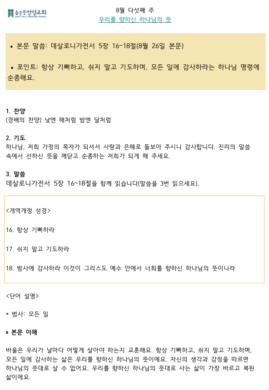2024년 8월 다섯째주 수요 가정예배 순서지 2024.08.24 14:07 소식/가정예배 순서지 2024년 8월 5주 가정예배.pdf 0.09MB 공유하기 게시글 관리 높은뜻 안성교회 '소식 > 가정예배 순서지' 카테고리의 다른 글 2024년 9월 둘째주 수요 가정예배 순서지 (0) 2024.09.08 2024년 9월 첫째주 수요 가정예배 순서지 (0) 2024.08.31 2024년 8월 넷째주 수요 가정예배 순서지 (0) 2024.08.17 2024년 8월 셋째주 수요 가정예배 순서지 (0) 2024.08.10 2024년 8월 둘째주 수요 가정예배 순서지 (0) 2024.08.03 댓글 공유하기 다른 글 댓글 이 글 공유하기 구독하기 구독하기 카카오톡 카카오톡 라인 라인 트위터 트위터 Facebook Facebook 카카오스토리 카카오스토리 밴드 밴드 네이버 블로그 네이버 블로그 Pocket Pocket Evernote Evernote 다른 글 2024년 9월 둘째주 수요 가정예배 순서지 2024년 9월 둘째주 수요 가정예배 순서지 2024.09.08 2024년 9월 첫째주 수요 가정예배 순서지 2024년 9월 첫째주 수요 가정예배 순서지 2024.08.31 2024년 8월 넷째주 수요 가정예배 순서지 2024년 8월 넷째주 수요 가정예배 순서지 2024.08.17 2024년 8월 셋째주 수요 가정예배 순서지 2024년 8월 셋째주 수요 가정예배 순서지 2024.08.10 다른 글 더 둘러보기