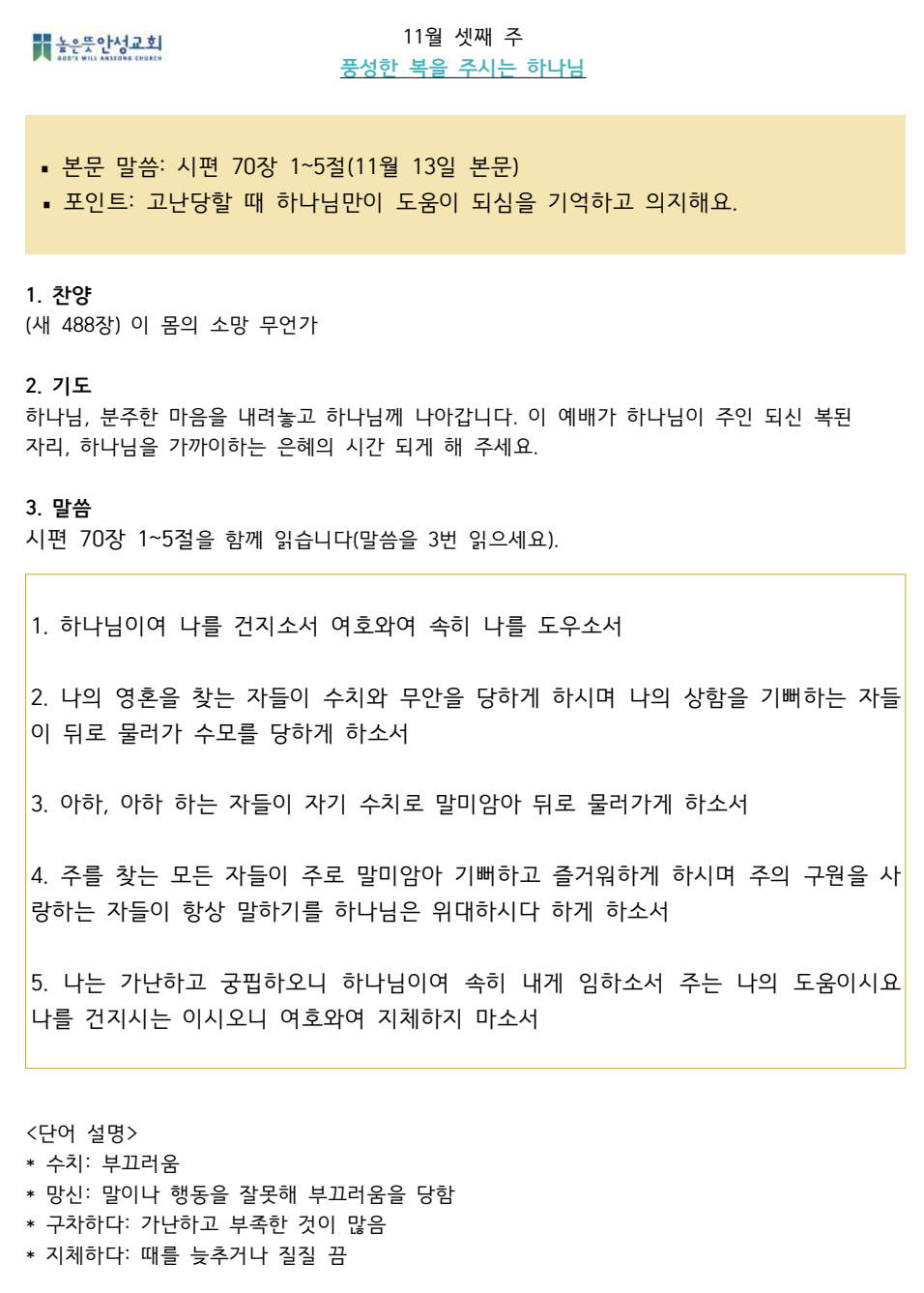 2024년 11월 셋째주 수요 가정예배 순서지 2024.11.09 14:33 소식/가정예배 순서지 2024년 11월 3주 가정예배.pdf 0.09MB 공유하기 게시글 관리 높은뜻 안성교회 '소식 > 가정예배 순서지' 카테고리의 다른 글 2024년 11월 다섯째주 수요 가정예배 순서지 (0) 2024.11.22 2024년 넷째주 수요 가정예배 순서지 (1) 2024.11.17 2024년 11월 둘째주 수요 가정예배 순서지 (0) 2024.11.01 2024년 11월 첫째주 수요 가정예배 순서지 (0) 2024.10.26 2024년 10월 넷째주 수요 가정예배 순서지 (0) 2024.10.19 댓글 공유하기 다른 글 댓글 이 글 공유하기 구독하기 구독하기 카카오톡 카카오톡 라인 라인 트위터 트위터 Facebook Facebook 카카오스토리 카카오스토리 밴드 밴드 네이버 블로그 네이버 블로그 Pocket Pocket Evernote Evernote 다른 글 2024년 11월 다섯째주 수요 가정예배 순서지 2024년 11월 다섯째주 수요 가정예배 순서지 2024.11.22 2024년 넷째주 수요 가정예배 순서지 2024년 넷째주 수요 가정예배 순서지 2024.11.17 2024년 11월 둘째주 수요 가정예배 순서지 2024년 11월 둘째주 수요 가정예배 순서지 2024.11.01 2024년 11월 첫째주 수요 가정예배 순서지 2024년 11월 첫째주 수요 가정예배 순서지 2024.10.26 다른 글 더 둘러보기