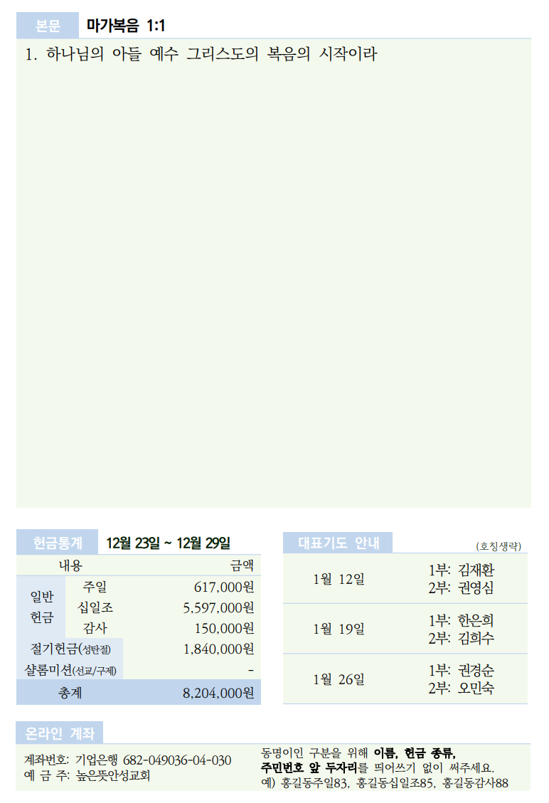 2025년 1월 5일 주보 2025.01.05 02:54 소식/교회주보 2025.01.05 주보.pdf 0.22MB 공유하기 게시글 관리 높은뜻 안성교회 '소식 > 교회주보' 카테고리의 다른 글 2025년 1월 19일 주보 (0) 2025.01.18 2025년 1월 12일 주보 (0) 2025.01.11 2024년 12월 29일 주보 (0) 2024.12.28 2024년 12월 22일 주보 (0) 2024.12.21 2024년 12월 15일 주보 (0) 2024.12.13 댓글 공유하기 다른 글 댓글 이 글 공유하기 구독하기 구독하기 카카오톡 카카오톡 라인 라인 트위터 트위터 Facebook Facebook 카카오스토리 카카오스토리 밴드 밴드 네이버 블로그 네이버 블로그 Pocket Pocket Evernote Evernote 다른 글 2025년 1월 19일 주보 2025년 1월 19일 주보 2025.01.18 2025년 1월 12일 주보 2025년 1월 12일 주보 2025.01.11 2024년 12월 29일 주보 2024년 12월 29일 주보 2024.12.28 2024년 12월 22일 주보 2024년 12월 22일 주보 2024.12.21 다른 글 더 둘러보기