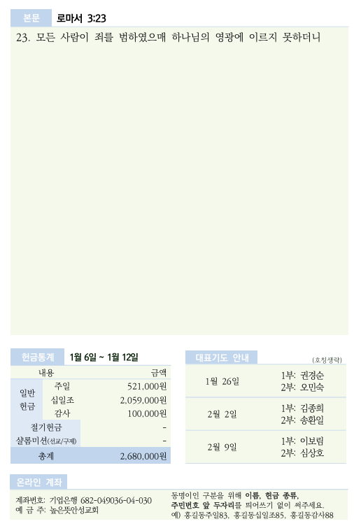 2025년 1월 19일 주보 2025.01.18 22:35 소식/교회주보 2025.01.19 주보.pdf 0.22MB 공유하기 게시글 관리 높은뜻 안성교회 '소식 > 교회주보' 카테고리의 다른 글 2025년 2월 2일 주보 (0) 2025.02.01 2025년 1월 26일 주보 (0) 2025.01.25 2025년 1월 12일 주보 (0) 2025.01.11 2025년 1월 5일 주보 (0) 2025.01.05 2024년 12월 29일 주보 (0) 2024.12.28 댓글 공유하기 다른 글 댓글 이 글 공유하기 구독하기 구독하기 카카오톡 카카오톡 라인 라인 트위터 트위터 Facebook Facebook 카카오스토리 카카오스토리 밴드 밴드 네이버 블로그 네이버 블로그 Pocket Pocket Evernote Evernote 다른 글 2025년 2월 2일 주보 2025년 2월 2일 주보 2025.02.01 2025년 1월 26일 주보 2025년 1월 26일 주보 2025.01.25 2025년 1월 12일 주보 2025년 1월 12일 주보 2025.01.11 2025년 1월 5일 주보 2025년 1월 5일 주보 2025.01.05 다른 글 더 둘러보기