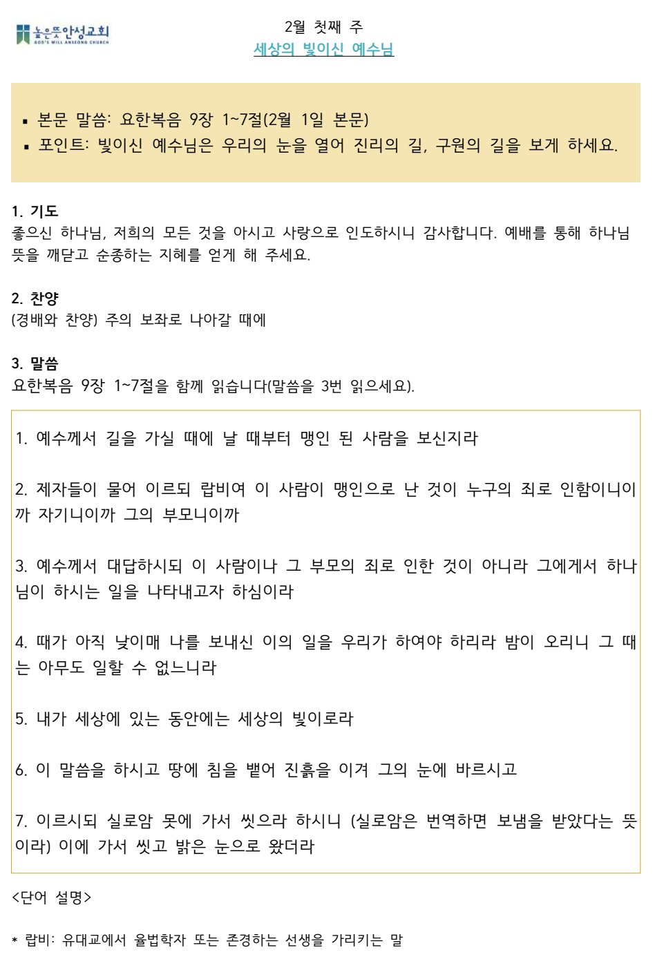 2025년 2월 첫째주 수요 가정예배 순서지 2025.01.25 13:43 소식/가정예배 순서지 2025년 2월 1주 가정예배.pdf 0.09MB 공유하기 게시글 관리 높은뜻 안성교회 '소식 > 가정예배 순서지' 카테고리의 다른 글 2025년 2월 셋째주 수요 가정예배 순서지 (0) 2025.02.09 2025년 2월 둘째주 수요 가정예배 순서지 (0) 2025.02.02 2025년 1월 넷째주 수요 가정예배 순서지 (0) 2025.01.18 2025년 1월 셋째주 수요 가정예배 순서지 (0) 2025.01.11 2025년 1월 둘째주 수요 가정예배 순서지 (0) 2025.01.05 댓글 공유하기 다른 글 댓글 이 글 공유하기 구독하기 구독하기 카카오톡 카카오톡 라인 라인 트위터 트위터 Facebook Facebook 카카오스토리 카카오스토리 밴드 밴드 네이버 블로그 네이버 블로그 Pocket Pocket Evernote Evernote 다른 글 2025년 2월 셋째주 수요 가정예배 순서지 2025년 2월 셋째주 수요 가정예배 순서지 2025.02.09 2025년 2월 둘째주 수요 가정예배 순서지 2025년 2월 둘째주 수요 가정예배 순서지 2025.02.02 2025년 1월 넷째주 수요 가정예배 순서지 2025년 1월 넷째주 수요 가정예배 순서지 2025.01.18 2025년 1월 셋째주 수요 가정예배 순서지 2025년 1월 셋째주 수요 가정예배 순서지 2025.01.11 다른 글 더 둘러보기