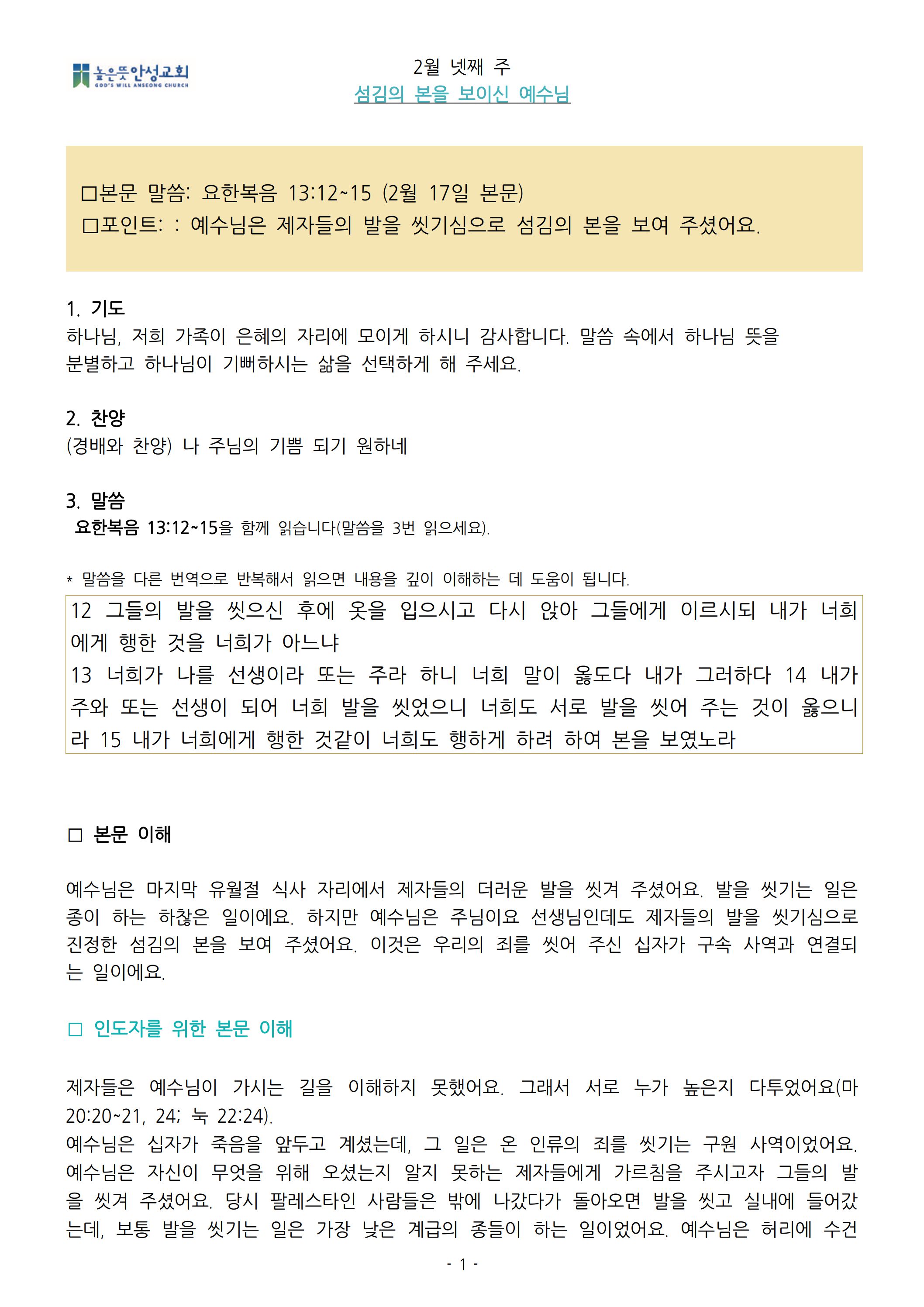 2025년 2월 셋째주 수요 가정예배 순서지 2025.02.16 08:58 소식/가정예배 순서지 2025년 2월 4주 가정예배.pdf 0.09MB 공유하기 게시글 관리 높은뜻 안성교회 '소식 > 가정예배 순서지' 카테고리의 다른 글 2025년 3월 둘째주 수요 가정예배 순서지 (0) 2025.03.08 2025년 2월 넷째주 수요 가정예배 순서지 (0) 2025.02.22 2025년 2월 셋째주 수요 가정예배 순서지 (0) 2025.02.09 2025년 2월 둘째주 수요 가정예배 순서지 (0) 2025.02.02 2025년 2월 첫째주 수요 가정예배 순서지 (0) 2025.01.25 댓글 공유하기 다른 글 댓글 이 글 공유하기 구독하기 구독하기 카카오톡 카카오톡 라인 라인 트위터 트위터 Facebook Facebook 카카오스토리 카카오스토리 밴드 밴드 네이버 블로그 네이버 블로그 Pocket Pocket Evernote Evernote 다른 글 2025년 3월 둘째주 수요 가정예배 순서지 2025년 3월 둘째주 수요 가정예배 순서지 2025.03.08 2025년 2월 넷째주 수요 가정예배 순서지 2025년 2월 넷째주 수요 가정예배 순서지 2025.02.22 2025년 2월 셋째주 수요 가정예배 순서지 2025년 2월 셋째주 수요 가정예배 순서지 2025.02.09 2025년 2월 둘째주 수요 가정예배 순서지 2025년 2월 둘째주 수요 가정예배 순서지 2025.02.02 다른 글 더 둘러보기