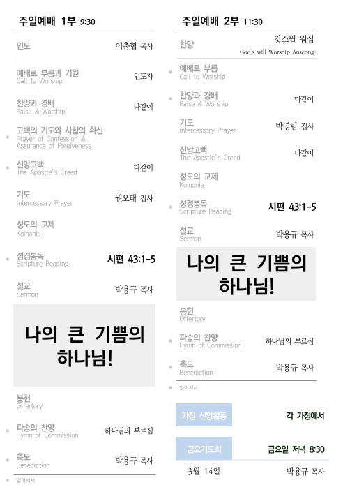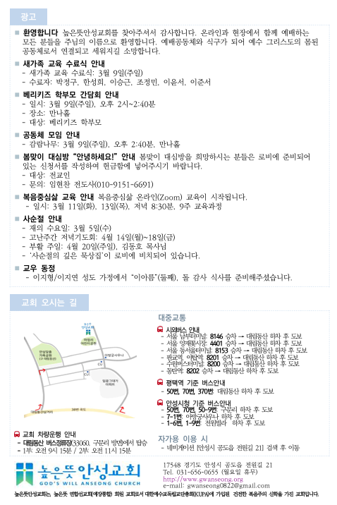 2025년 3월 9일 주보 2025.03.08 20:10 소식/교회주보 2025.03.09 주보.pdf 0.23MB 공유하기 게시글 관리 높은뜻 안성교회 '소식 > 교회주보' 카테고리의 다른 글 2025년 3월 23일 주보 (0) 2025.03.22 2025년 3월 16일 주보 (0) 2025.03.15 2025년 2월 23일 주보 (0) 2025.02.22 2025년 2월 16일 주보 (0) 2025.02.16 2025년 2월 9일 주보 (0) 2025.02.09 댓글 공유하기 다른 글 댓글 이 글 공유하기 구독하기 구독하기 카카오톡 카카오톡 라인 라인 트위터 트위터 Facebook Facebook 카카오스토리 카카오스토리 밴드 밴드 네이버 블로그 네이버 블로그 Pocket Pocket Evernote Evernote 다른 글 2025년 3월 23일 주보 2025년 3월 23일 주보 2025.03.22 2025년 3월 16일 주보 2025년 3월 16일 주보 2025.03.15 2025년 2월 23일 주보 2025년 2월 23일 주보 2025.02.22 2025년 2월 16일 주보 2025년 2월 16일 주보 2025.02.16 다른 글 더 둘러보기