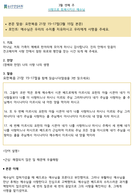 2025년 3월 셋째주 수요 가정예배 순서지 2025.03.15 23:28 소식/가정예배 순서지 2025년 3월 3주 가정예배.pdf 0.10MB 공유하기 게시글 관리 높은뜻 안성교회 '소식 > 가정예배 순서지' 카테고리의 다른 글 2025년 3월 다섯째주 수요 가정예배 순서지 (0) 2025.03.28 2025년 3월 넷째주 수요 가정예배 순서지 (0) 2025.03.22 2025년 3월 둘째주 수요 가정예배 순서지 (0) 2025.03.08 2025년 2월 넷째주 수요 가정예배 순서지 (0) 2025.02.22 2025년 2월 셋째주 수요 가정예배 순서지 (0) 2025.02.16 댓글 공유하기 다른 글 댓글 이 글 공유하기 구독하기 구독하기 카카오톡 카카오톡 라인 라인 트위터 트위터 Facebook Facebook 카카오스토리 카카오스토리 밴드 밴드 네이버 블로그 네이버 블로그 Pocket Pocket Evernote Evernote 다른 글 2025년 3월 다섯째주 수요 가정예배 순서지 2025년 3월 다섯째주 수요 가정예배 순서지 2025.03.28 2025년 3월 넷째주 수요 가정예배 순서지 2025년 3월 넷째주 수요 가정예배 순서지 2025.03.22 2025년 3월 둘째주 수요 가정예배 순서지 2025년 3월 둘째주 수요 가정예배 순서지 2025.03.08 2025년 2월 넷째주 수요 가정예배 순서지 2025년 2월 넷째주 수요 가정예배 순서지 2025.02.22 다른 글 더 둘러보기